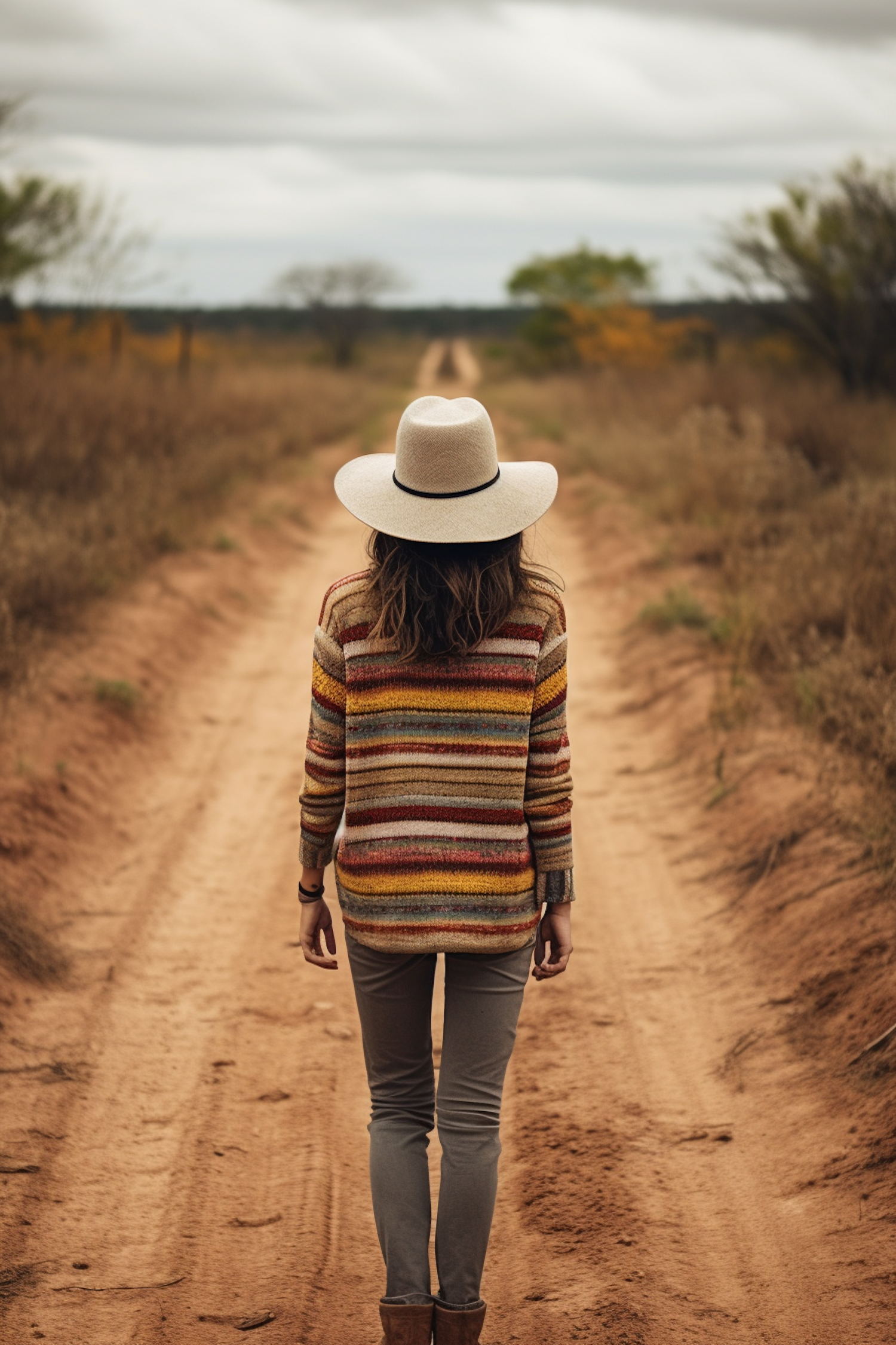 Person in a striped sweater and hat walking on a dirt path surrounded by dry grass and trees under an overcast sky.