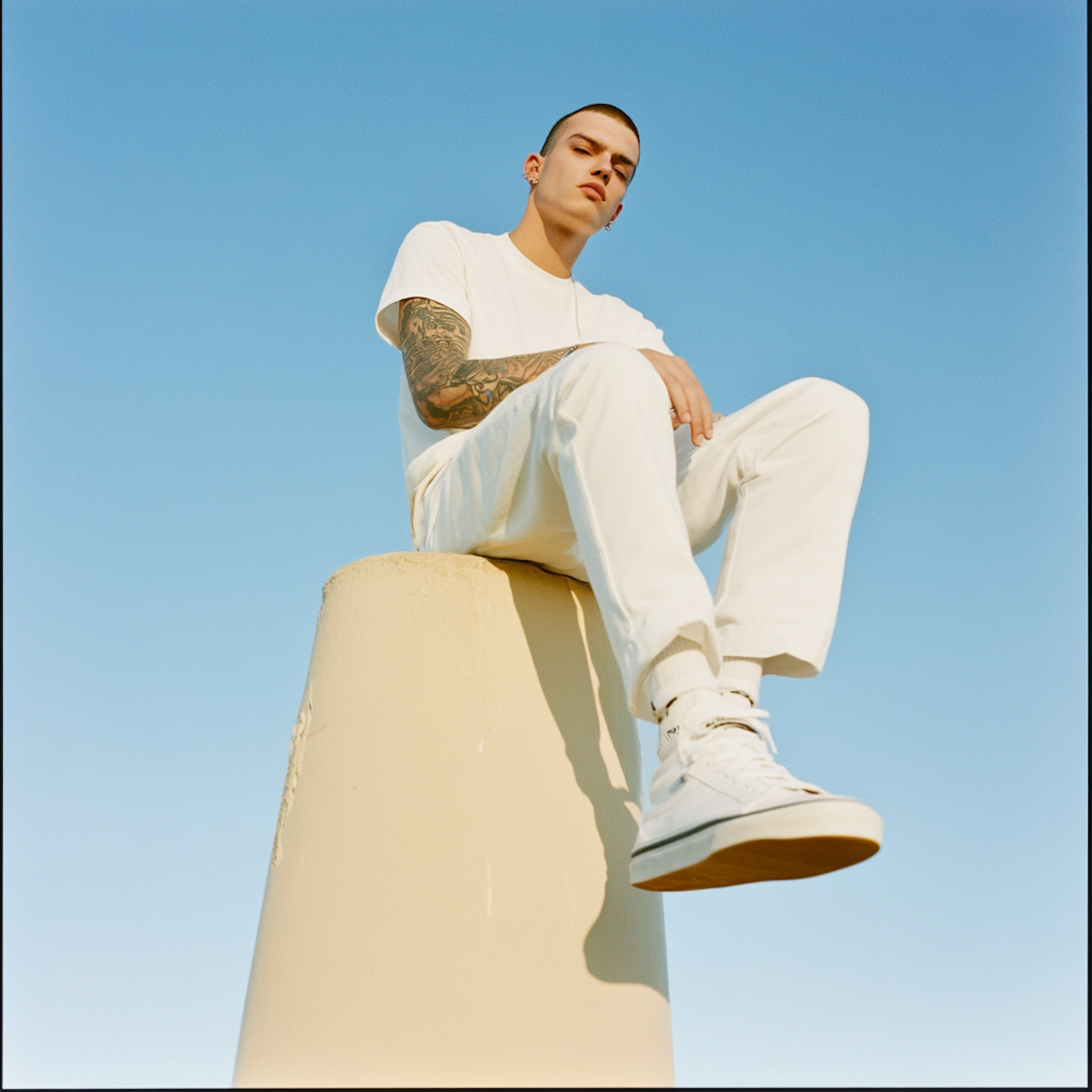 Young man with tattoos in white outfit sits on a beige structure against a clear blue sky, exuding confidence and style.