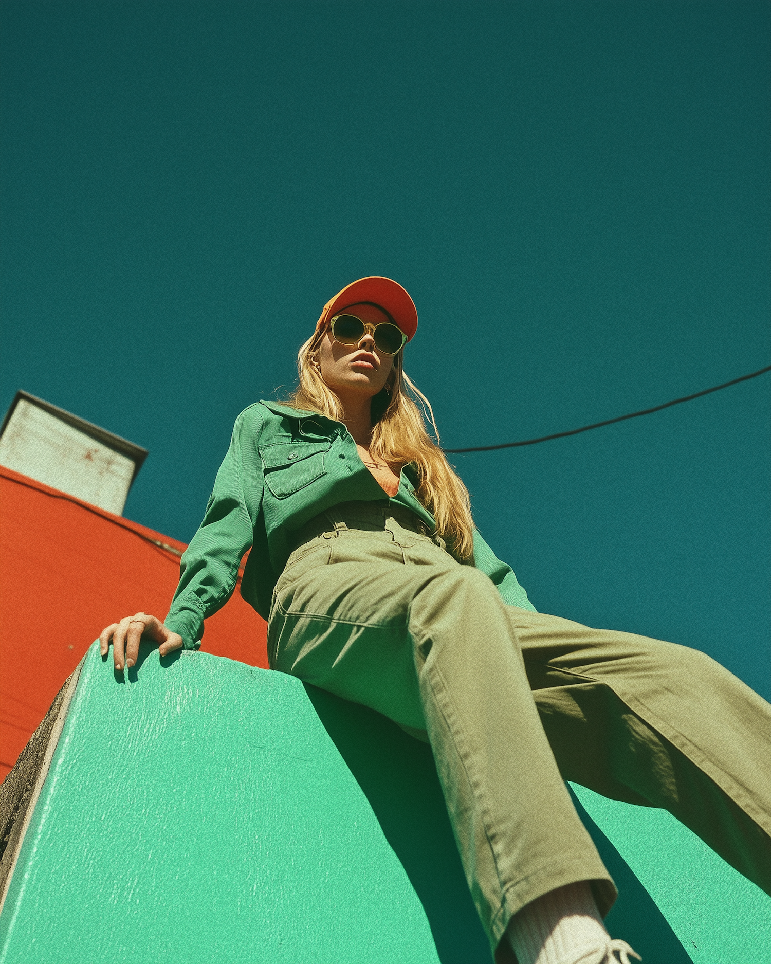 Stylish woman in green outfit and red cap sits on turquoise structure against a vivid teal sky and red building.