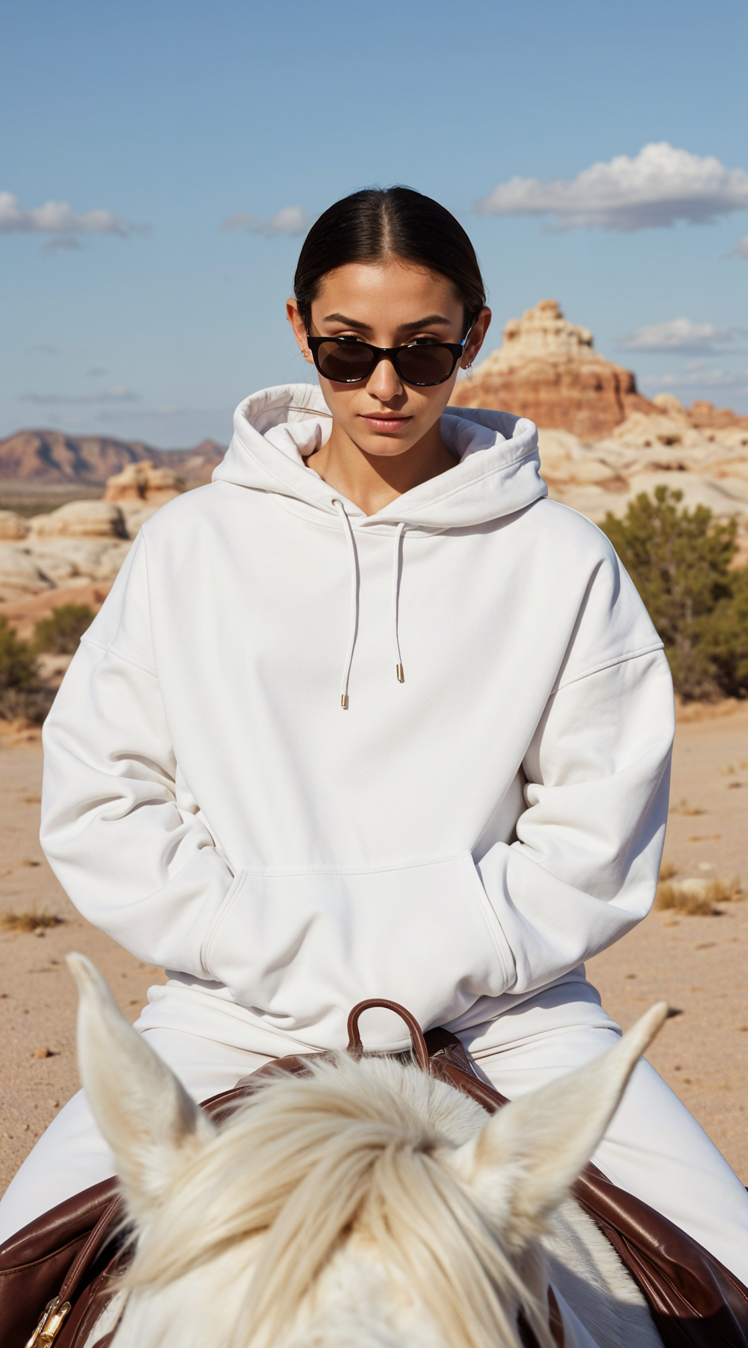 Woman in white hoodie and sunglasses riding a white horse in a desert landscape with rocky formations and clear blue sky.