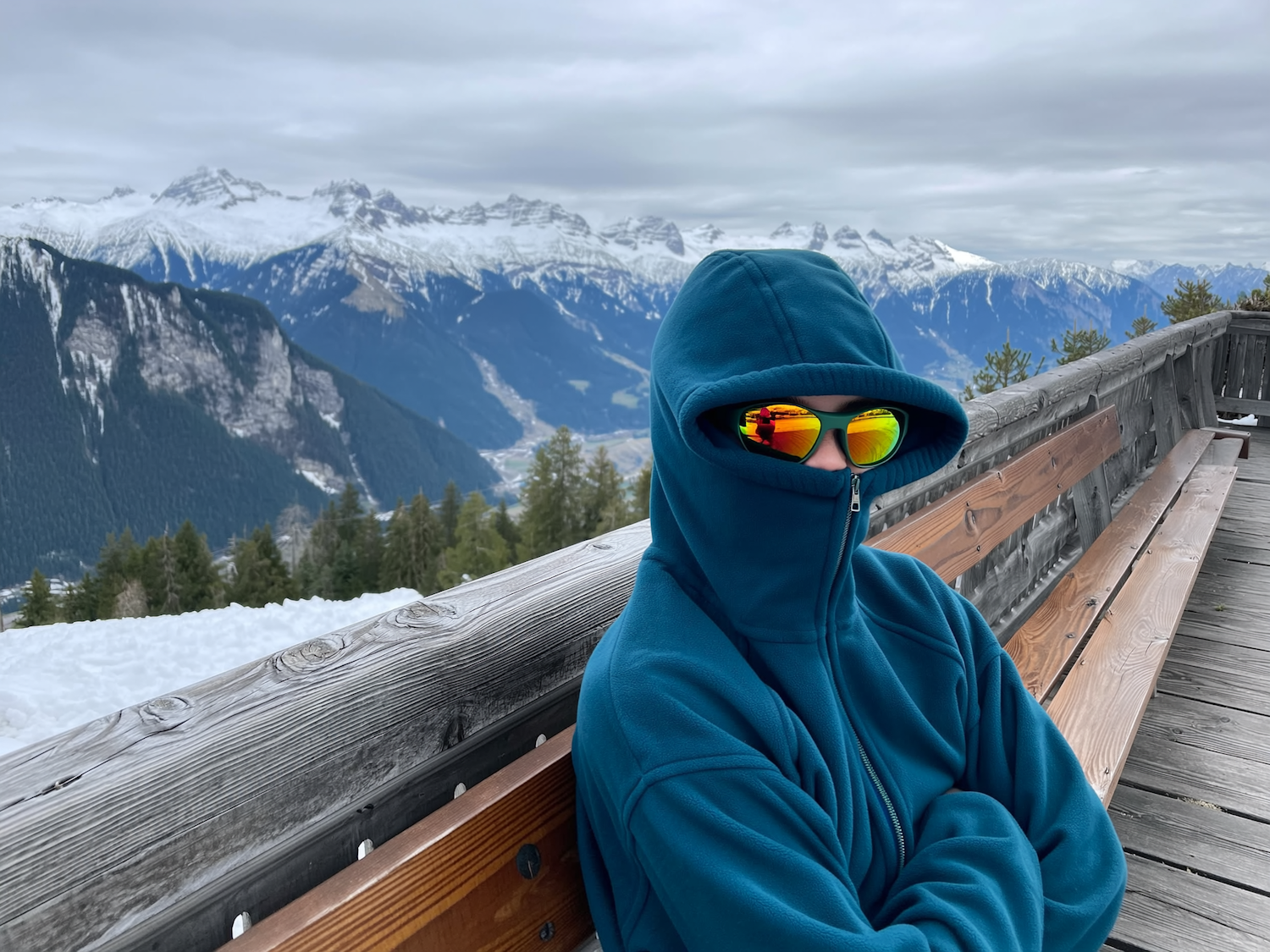 Person in teal hoodie and reflective sunglasses sitting on a bench with a stunning snowy mountain range in the background.