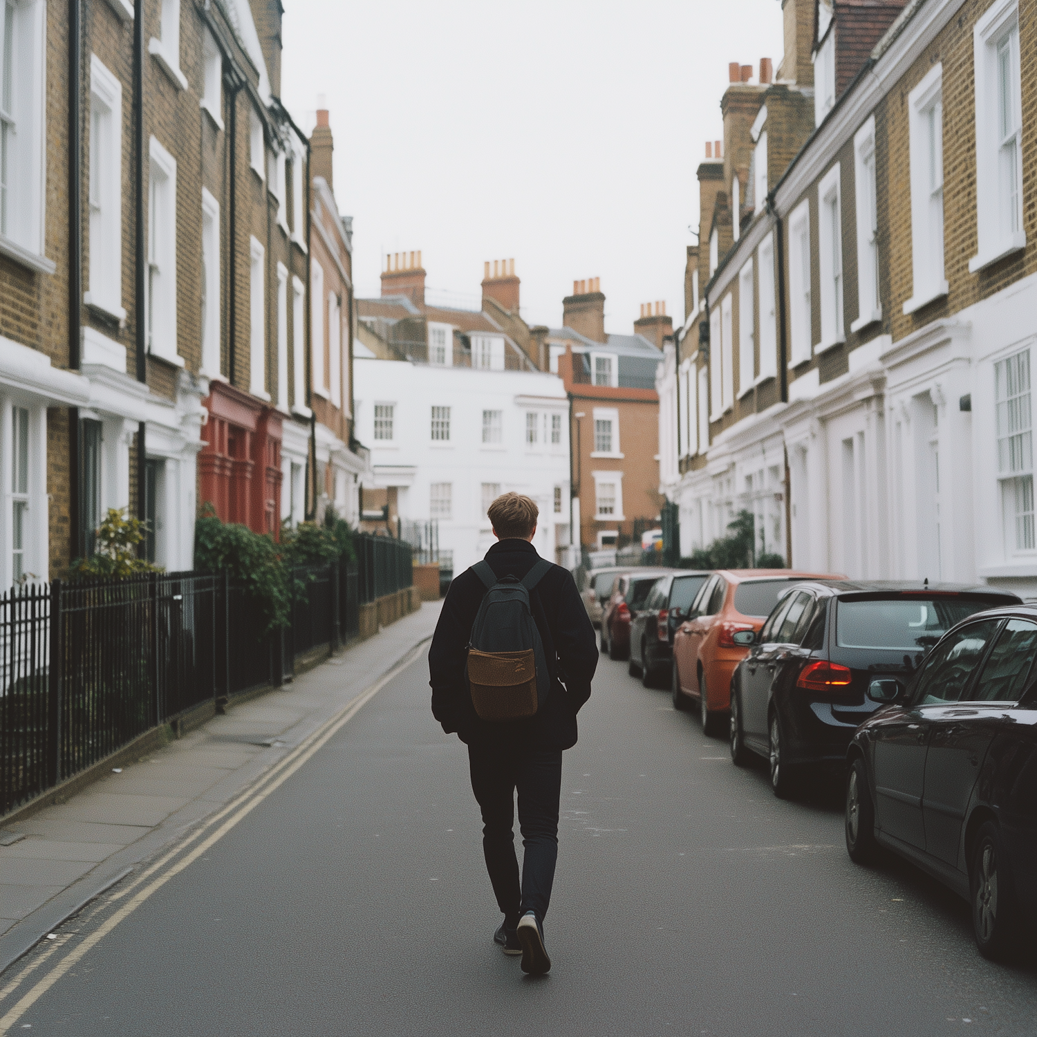 A person walks down a quiet street lined with charming brick townhouses and parked cars on an overcast day.