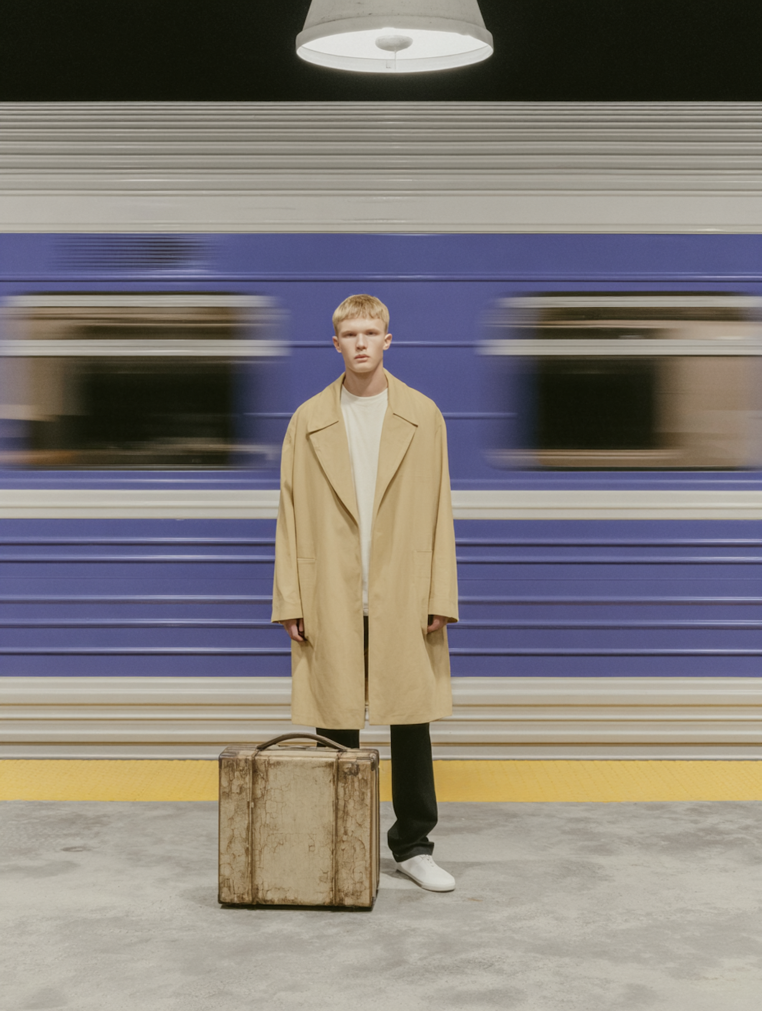 A person in a beige coat stands on a train platform with a vintage suitcase, as a blue train speeds by in the background.