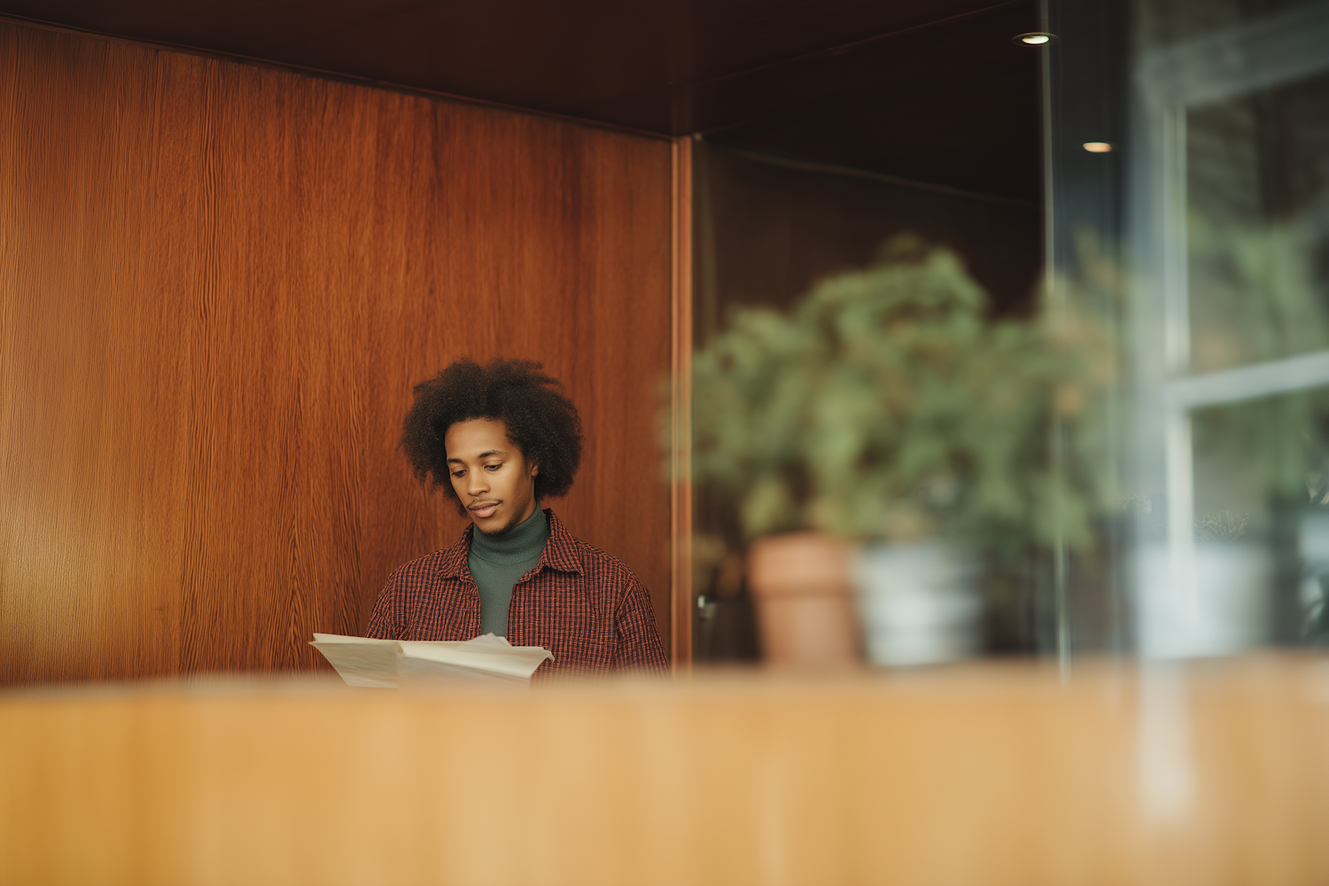 A person reading a document in a warm, wood-paneled room with potted plants in the foreground, creating a cozy atmosphere.