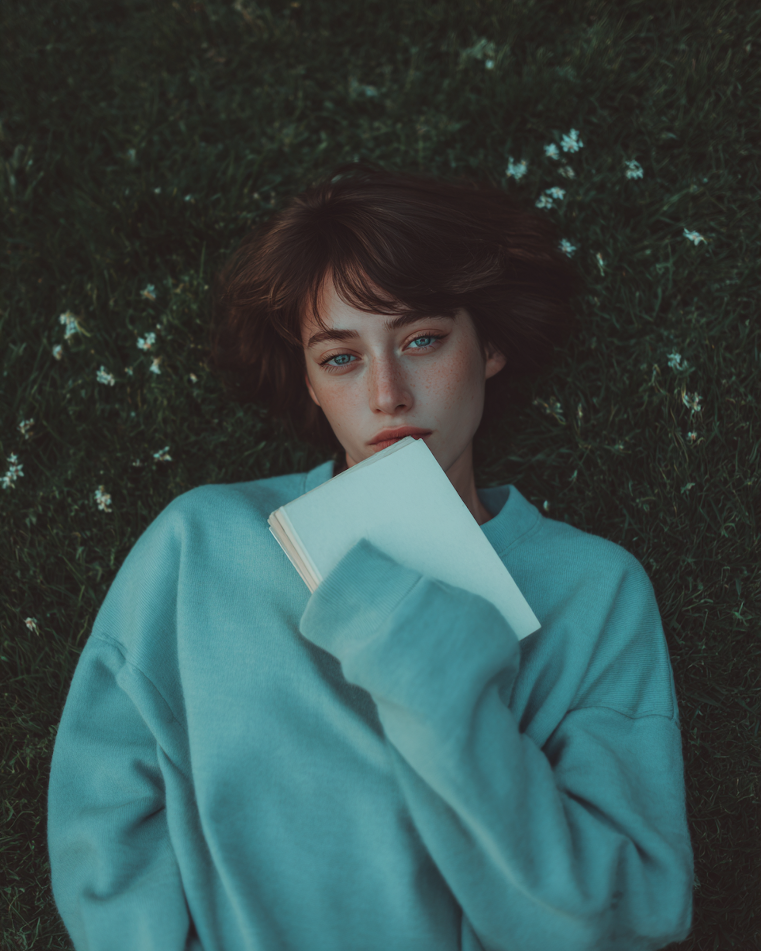 A serene moment of a person lying on grass, holding a book, wearing a light blue sweater, surrounded by small white flowers.
