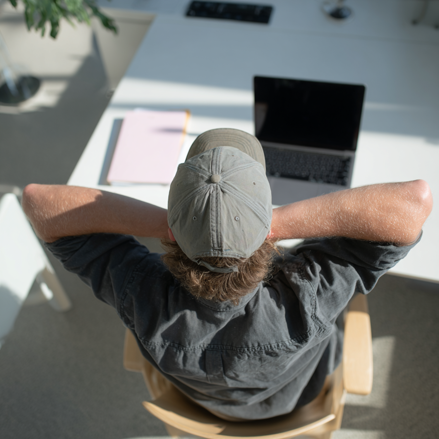 Person relaxing at a desk with a laptop and folder, viewed from behind, in a bright and modern office setting.
