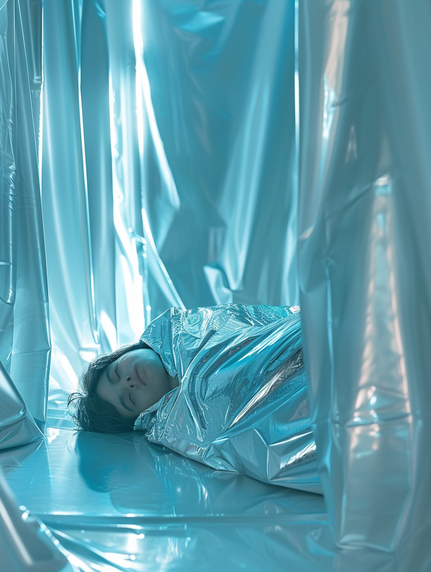 Person resting wrapped in a reflective blanket, surrounded by a serene blue metallic space creating a calm futuristic ambiance.