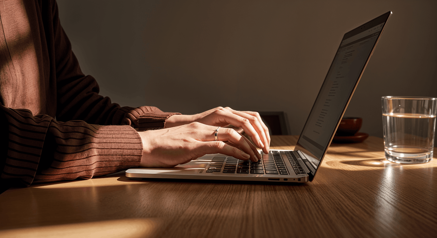 Person typing on a laptop in warm sunlight, wearing a brown sweater. A glass of water sits nearby on a wooden table.
