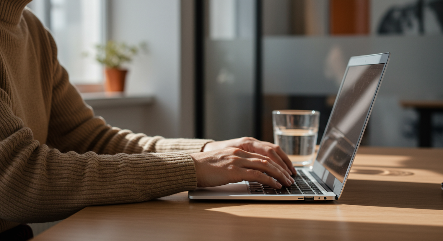 A person in a beige sweater works on a laptop at a wooden desk, with a glass of water and a potted plant in a bright, cozy setting.