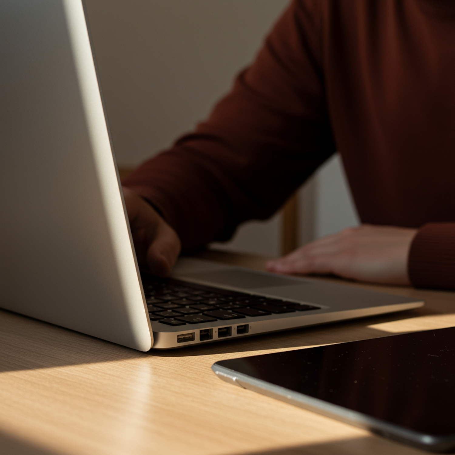 A person working on a silver laptop at a wooden desk, with a tablet nearby, in warm natural lighting.
