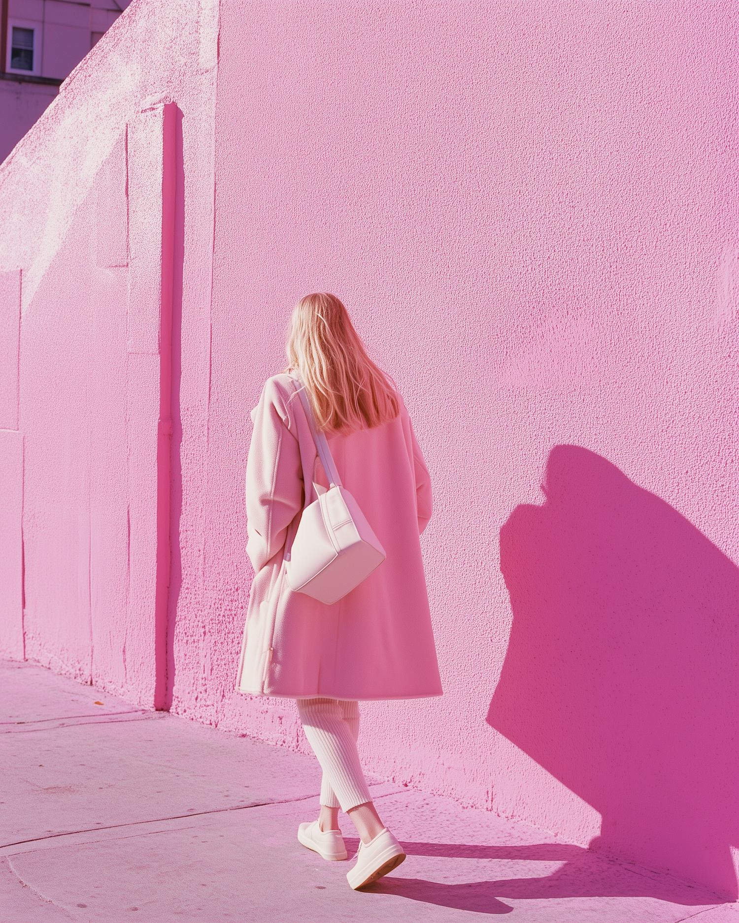 Woman in pink coat walking by a vibrant pink wall, carrying a white handbag. Striking color contrast with pink and white tones.