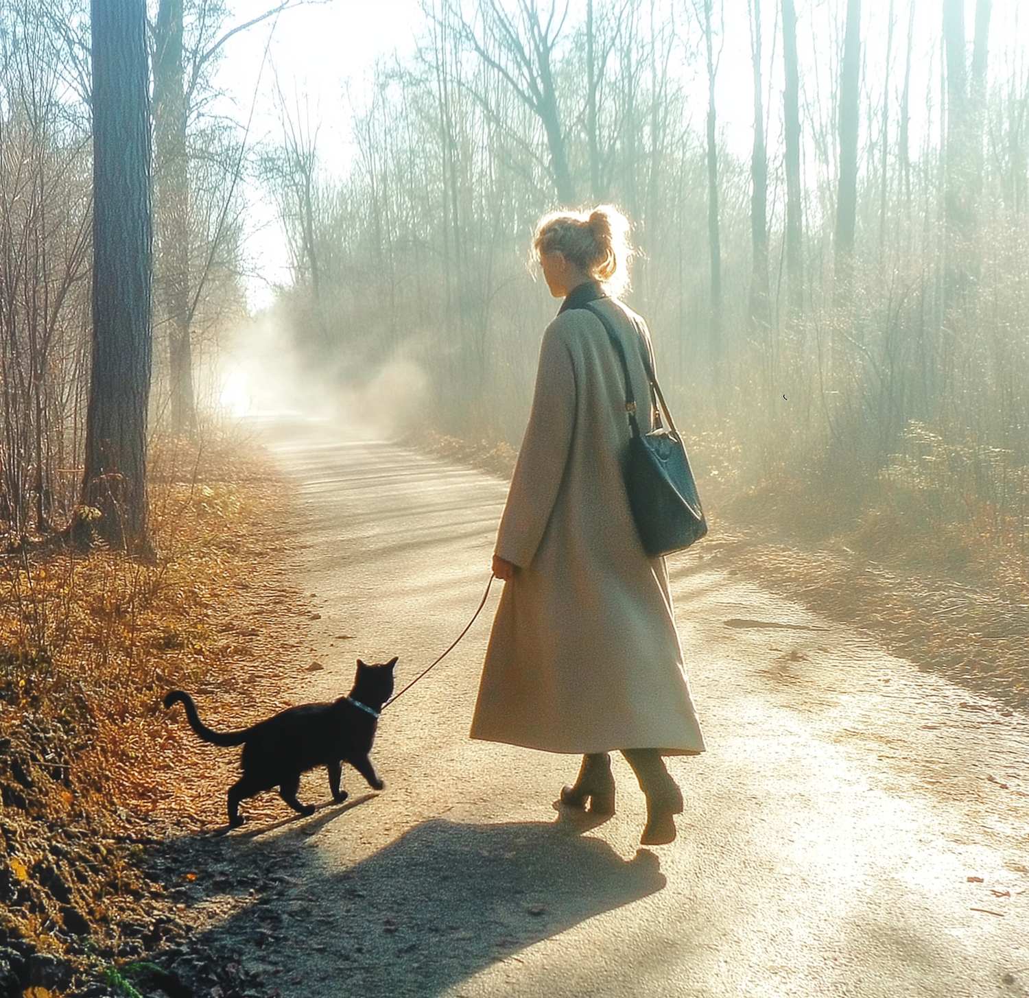 Woman walking a black cat on a leash through a misty forest path, wearing a beige coat and black boots. Serene morning light.