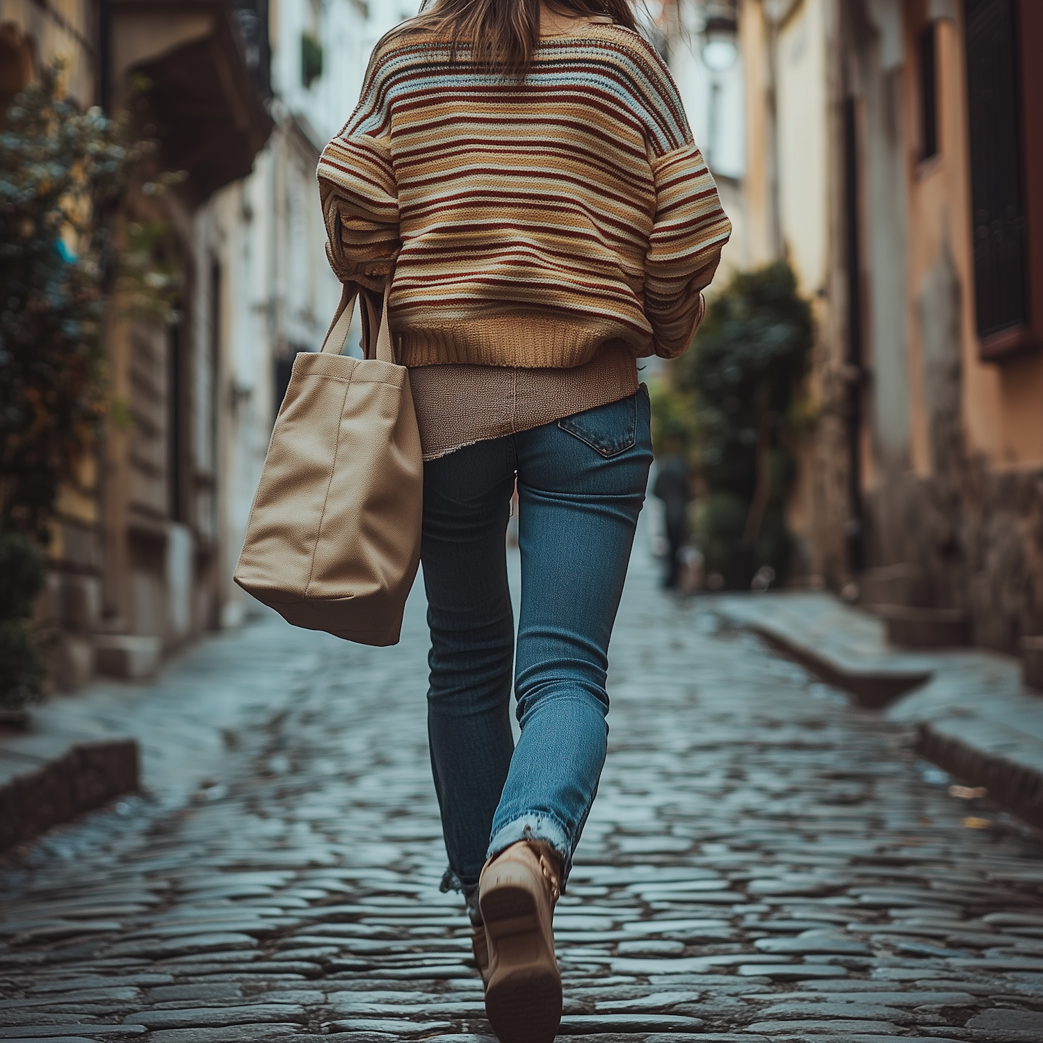 Woman in striped sweater and jeans walking down a cobblestone street, carrying a beige tote bag. Warm, cozy urban scene.