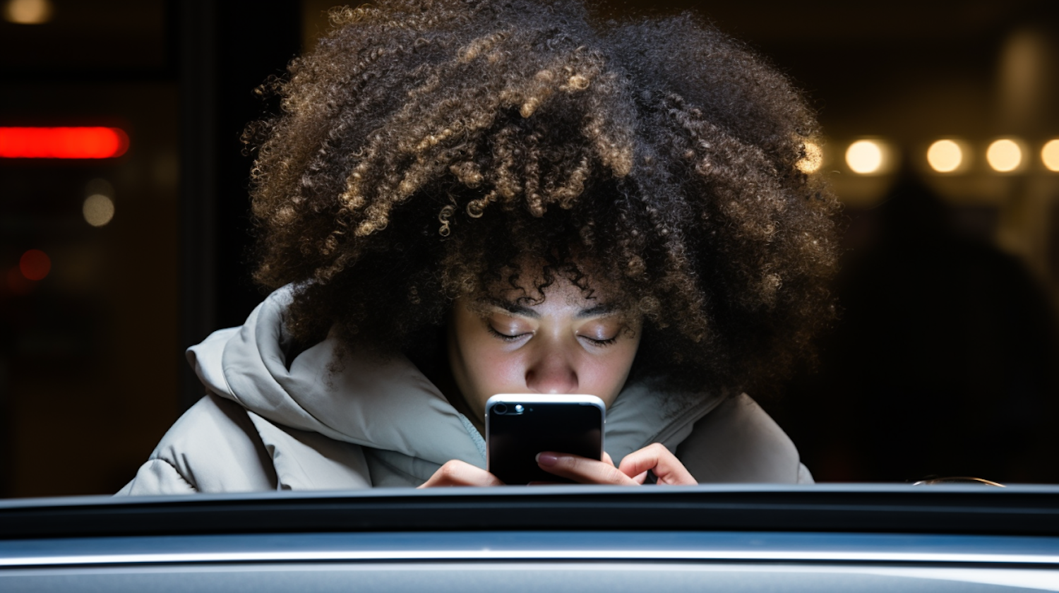 Young woman with curly hair focused on her smartphone, illuminated by its light, in a dimly lit indoor setting.