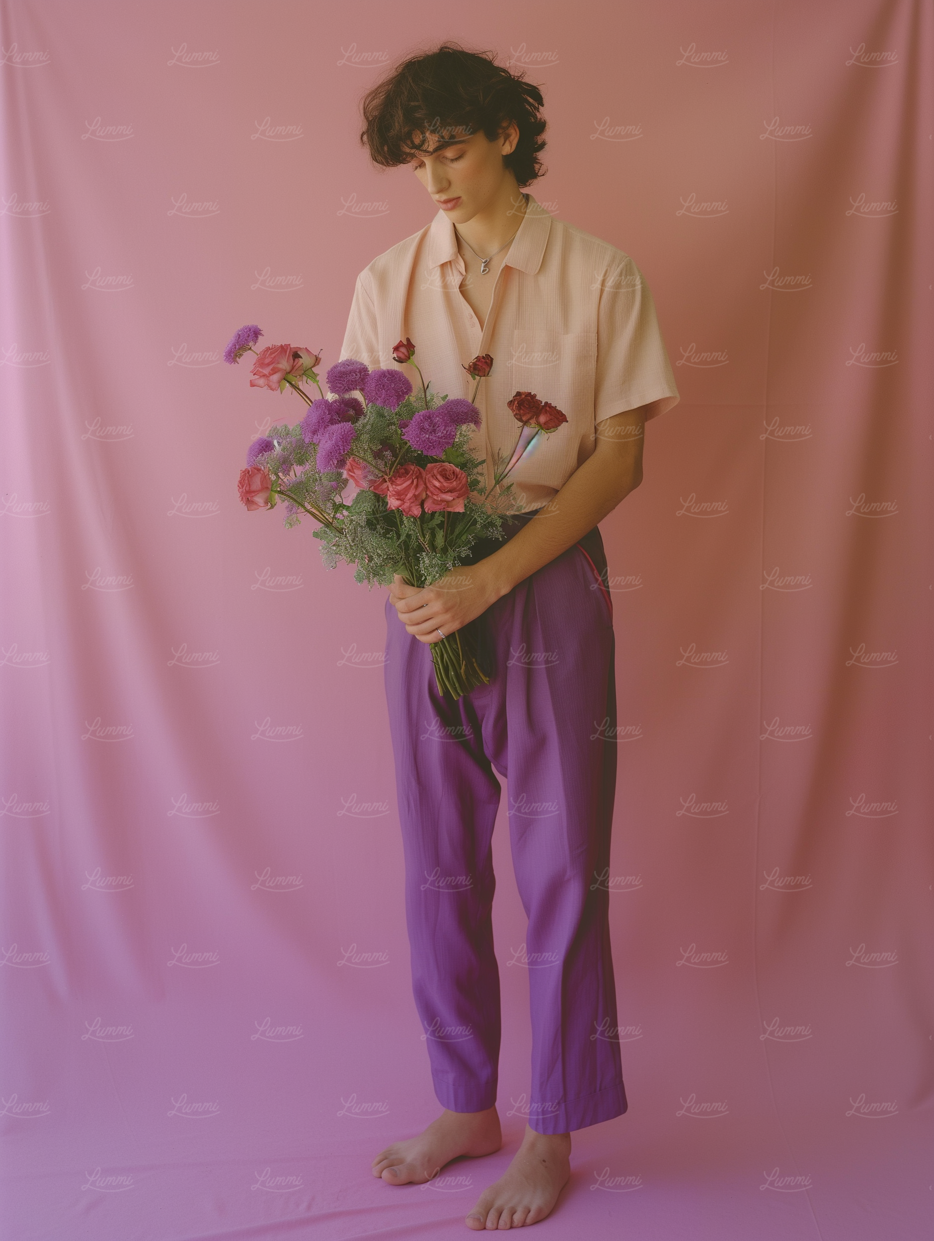 Young man in peach shirt and purple pants holding a colorful bouquet against a pink backdrop, exuding a serene and artistic vibe.