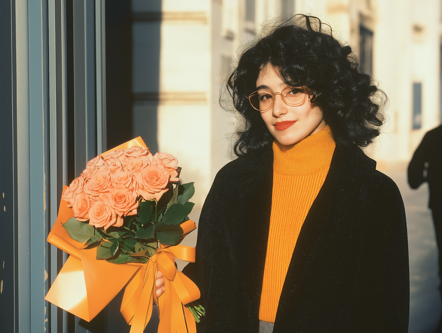 Young woman with curly hair holds peach roses in orange wrap, wearing glasses and an orange sweater. Sunlit urban background.