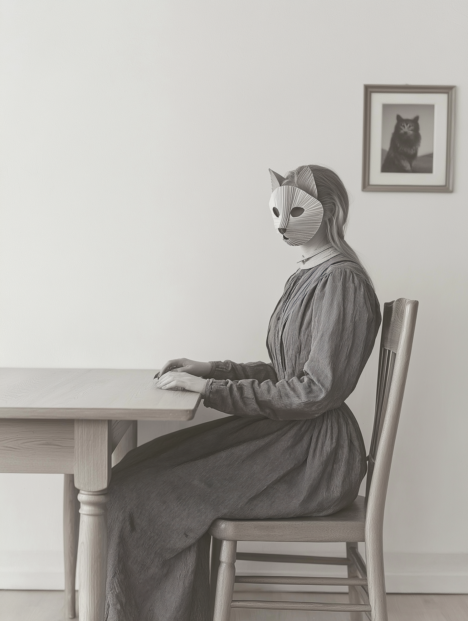 A person in a cat mask sits at a table, creating a surreal, vintage atmosphere with a monochromatic color scheme.