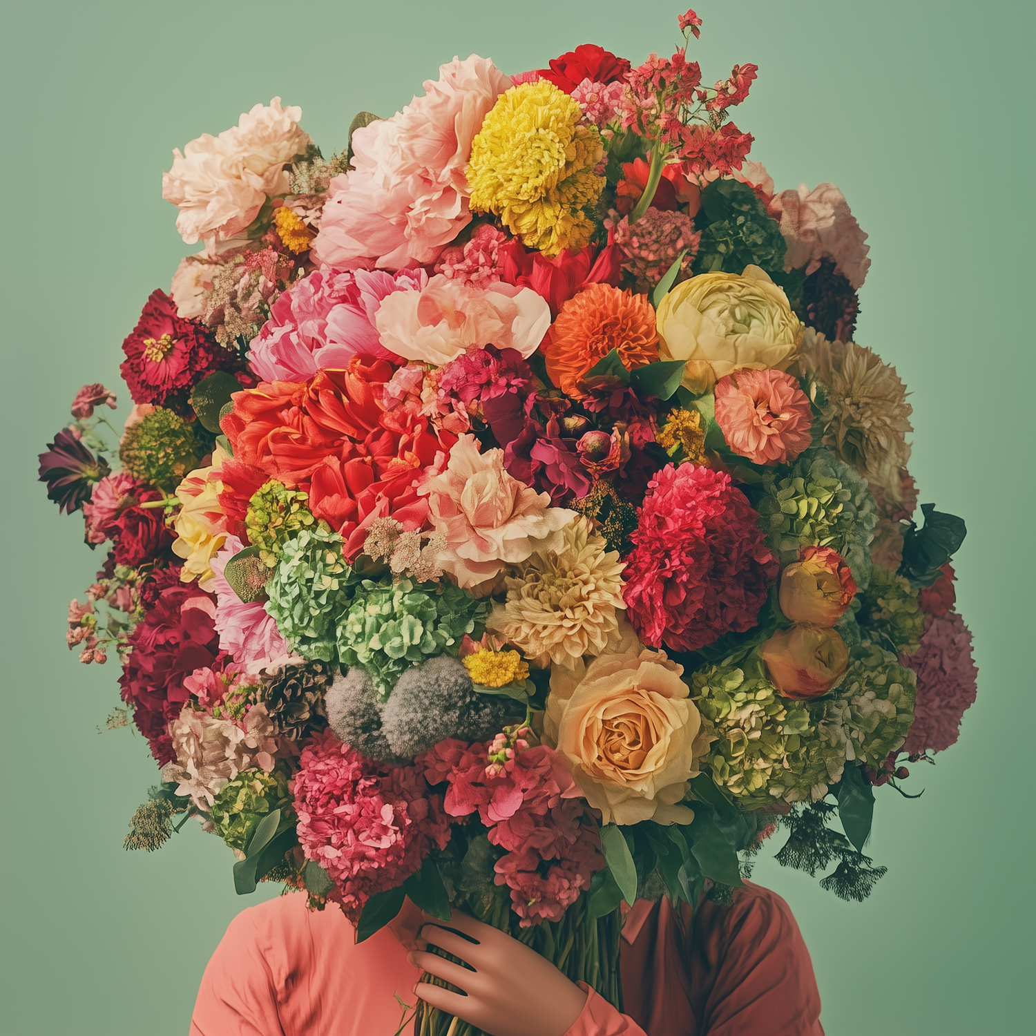 A vibrant bouquet of colorful flowers obscures a person against a soft green background, creating a striking visual effect.