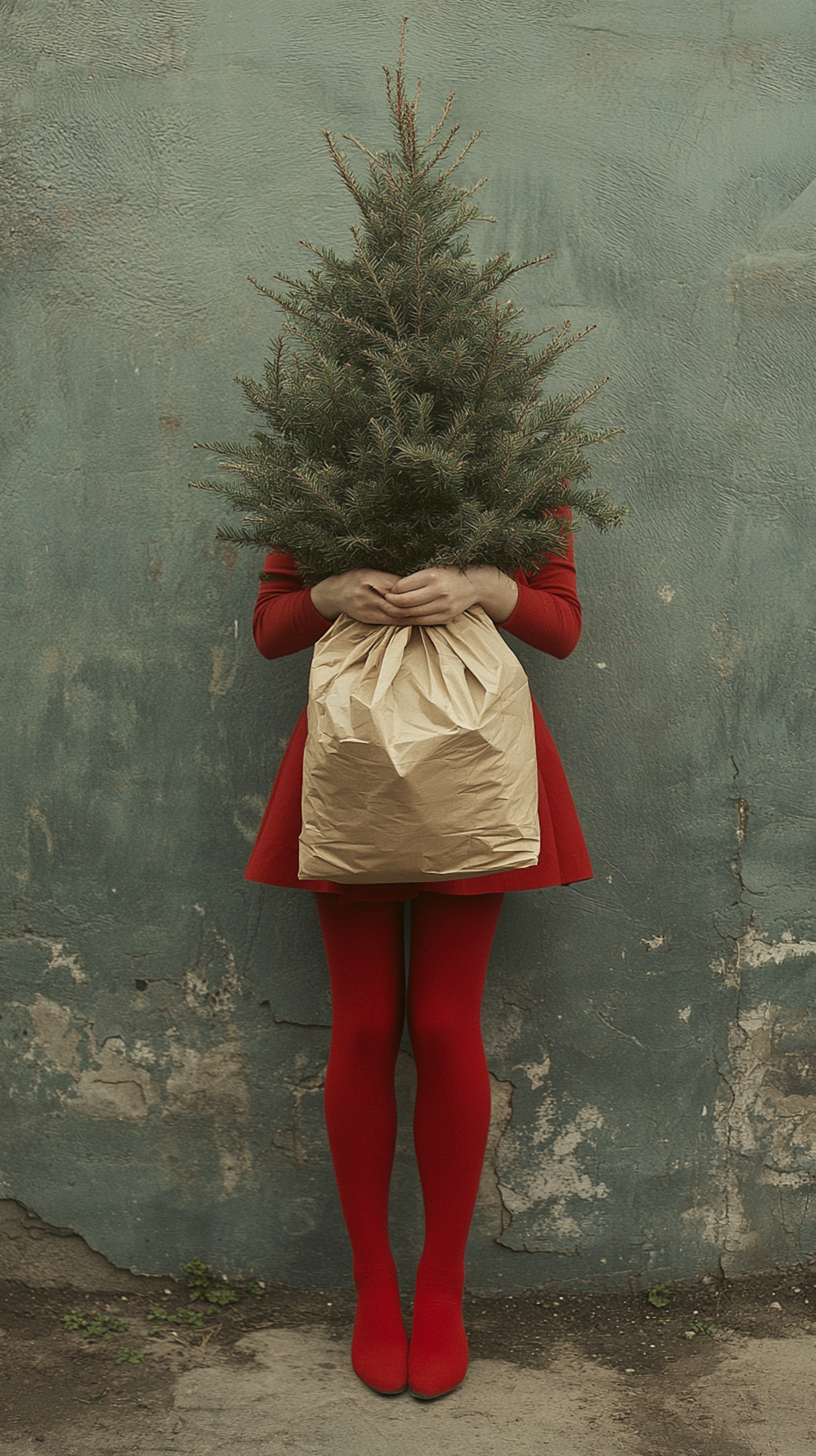 Person in red dress and tights holding a small Christmas tree against a rustic teal wall, creating a festive and whimsical vibe.