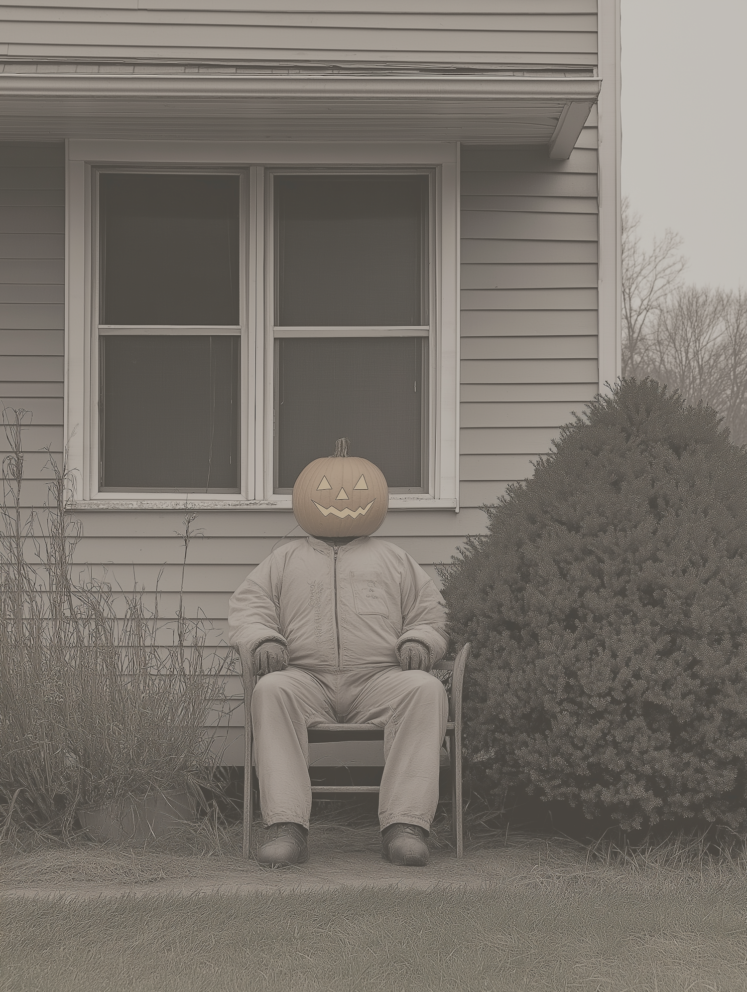 A person with a pumpkin head sits in front of a house, wearing a padded jumpsuit. The muted tones create a vintage, eerie atmosphere.