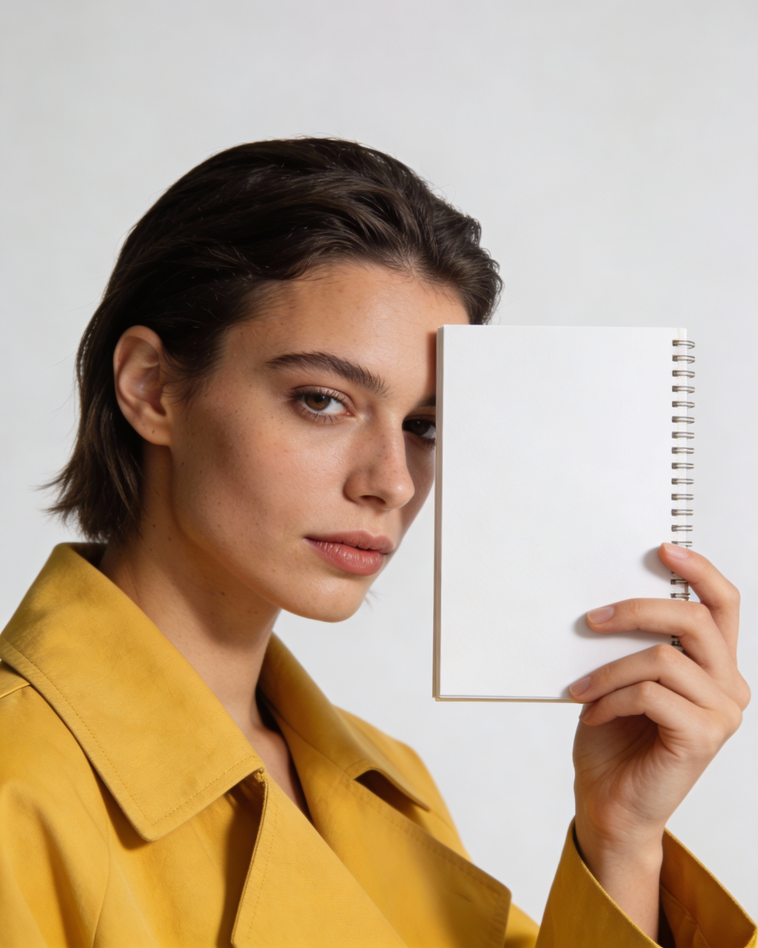 A person in a yellow jacket holds a blank spiral notebook, creating a minimalist and creative composition against a plain background.