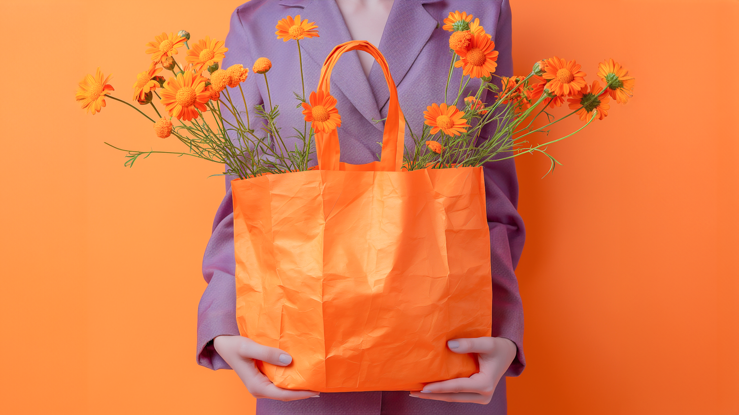 Person in purple jacket holding an orange bag with flowers against an orange background.