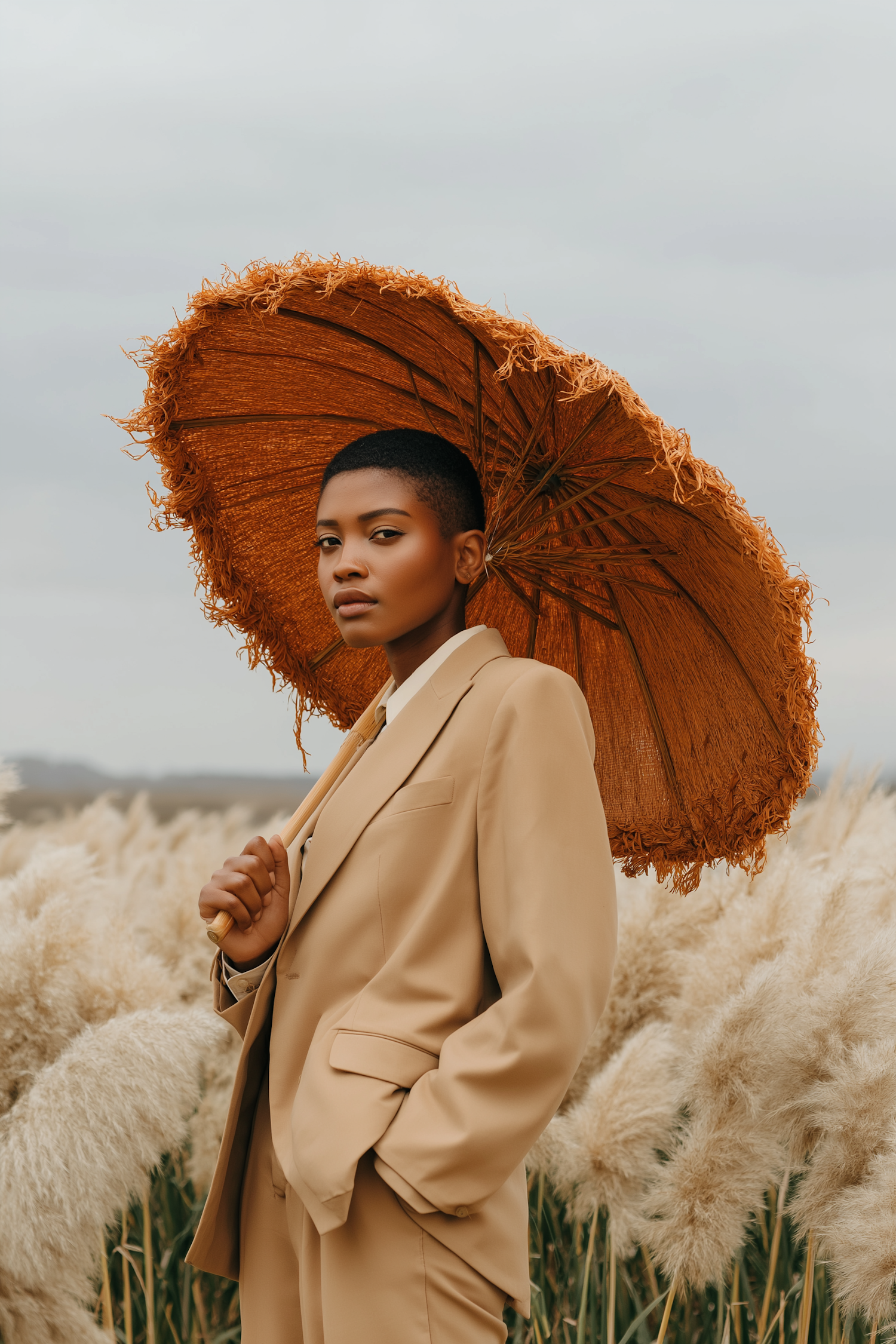 A person in a tan suit holds an orange parasol in a field of tall grass, creating a warm and stylish scene.