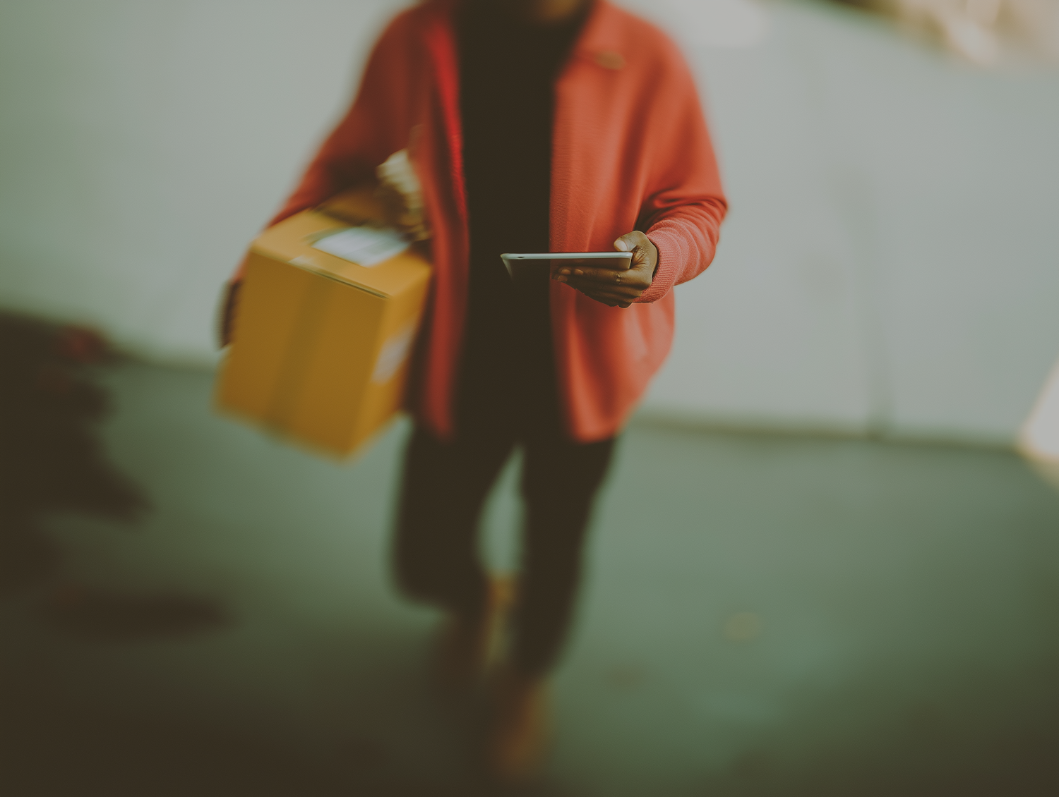 Person in a red sweater holding a yellow package and a smartphone, walking outdoors with a blurred background.