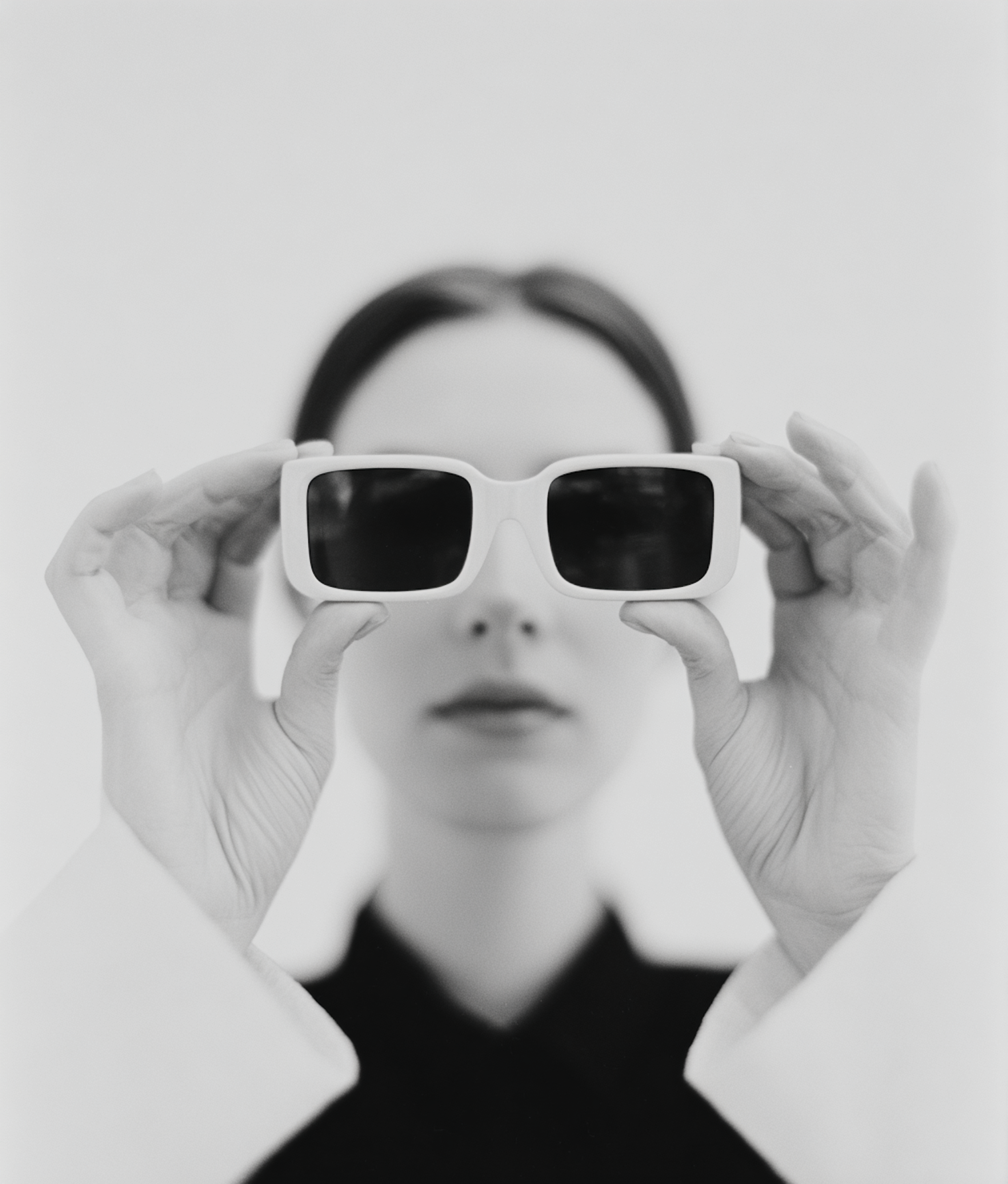 Stylish black-and-white photo of a person holding white-framed sunglasses, creating a modern and minimalist aesthetic.