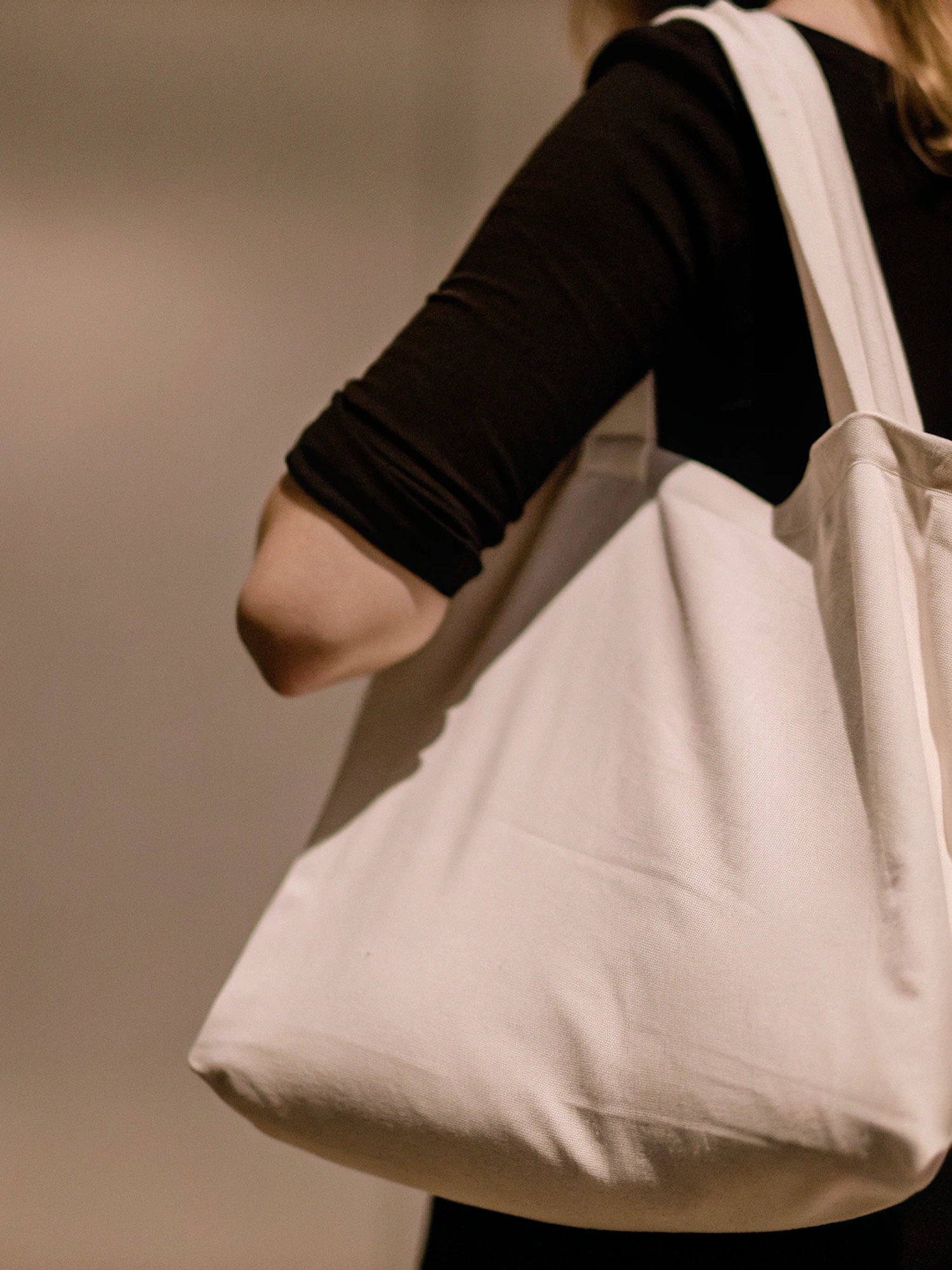 Close-up of a person carrying a white canvas tote bag with a black outfit, set against a softly blurred background.