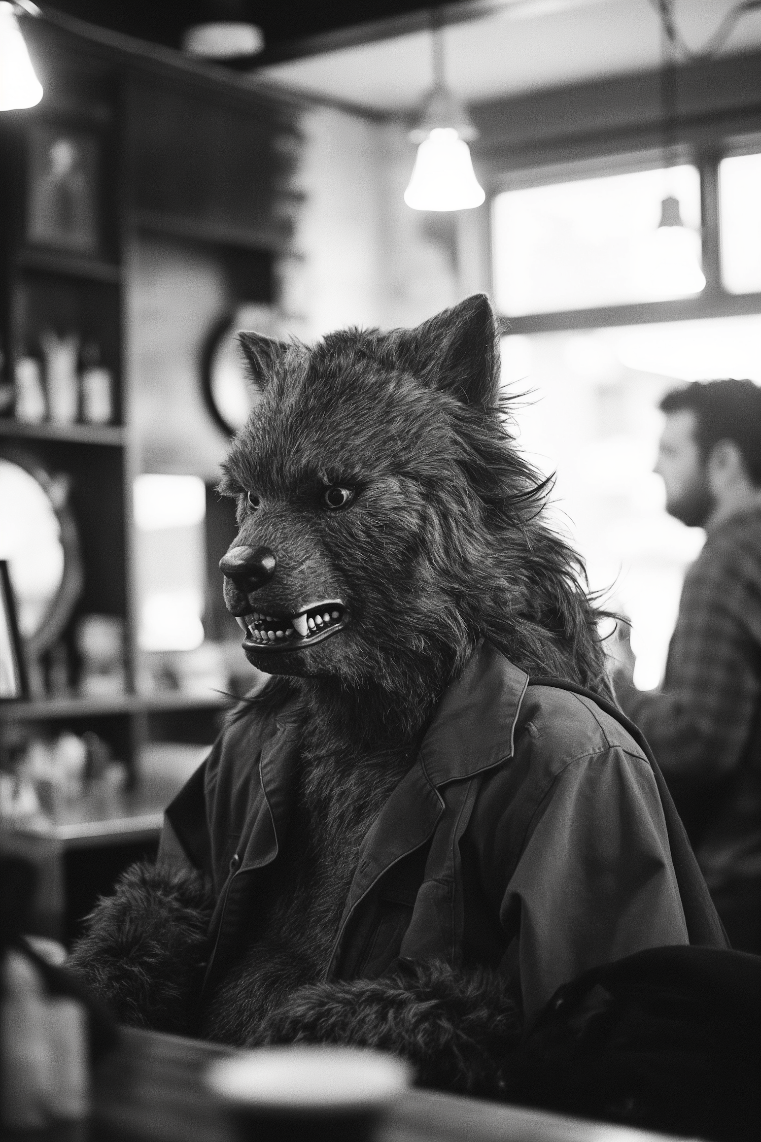 A person in a realistic werewolf costume sits in a cafe, creating a humorous contrast with the casual setting. Black and white photo.