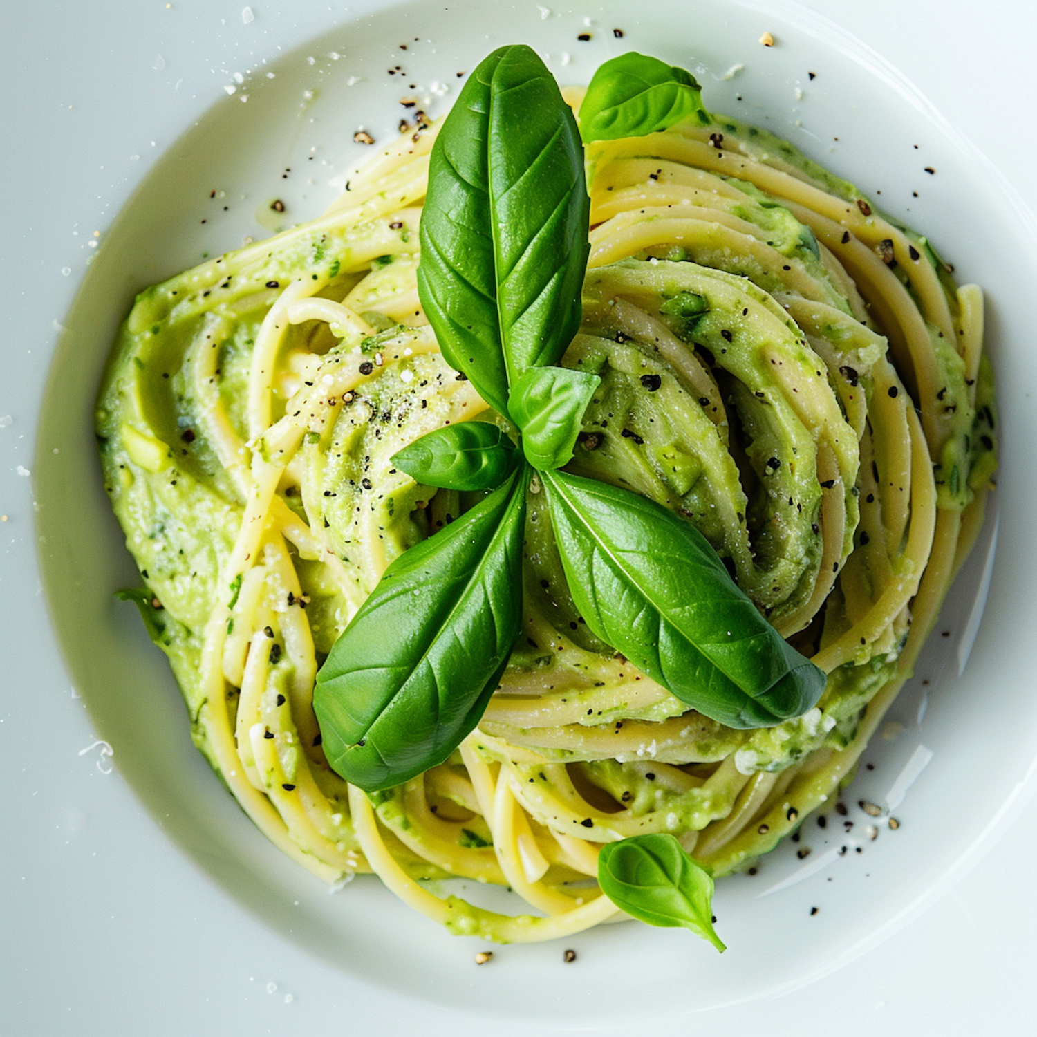 Delicious spaghetti with creamy green sauce and fresh basil, elegantly plated for a vibrant and appetizing look.