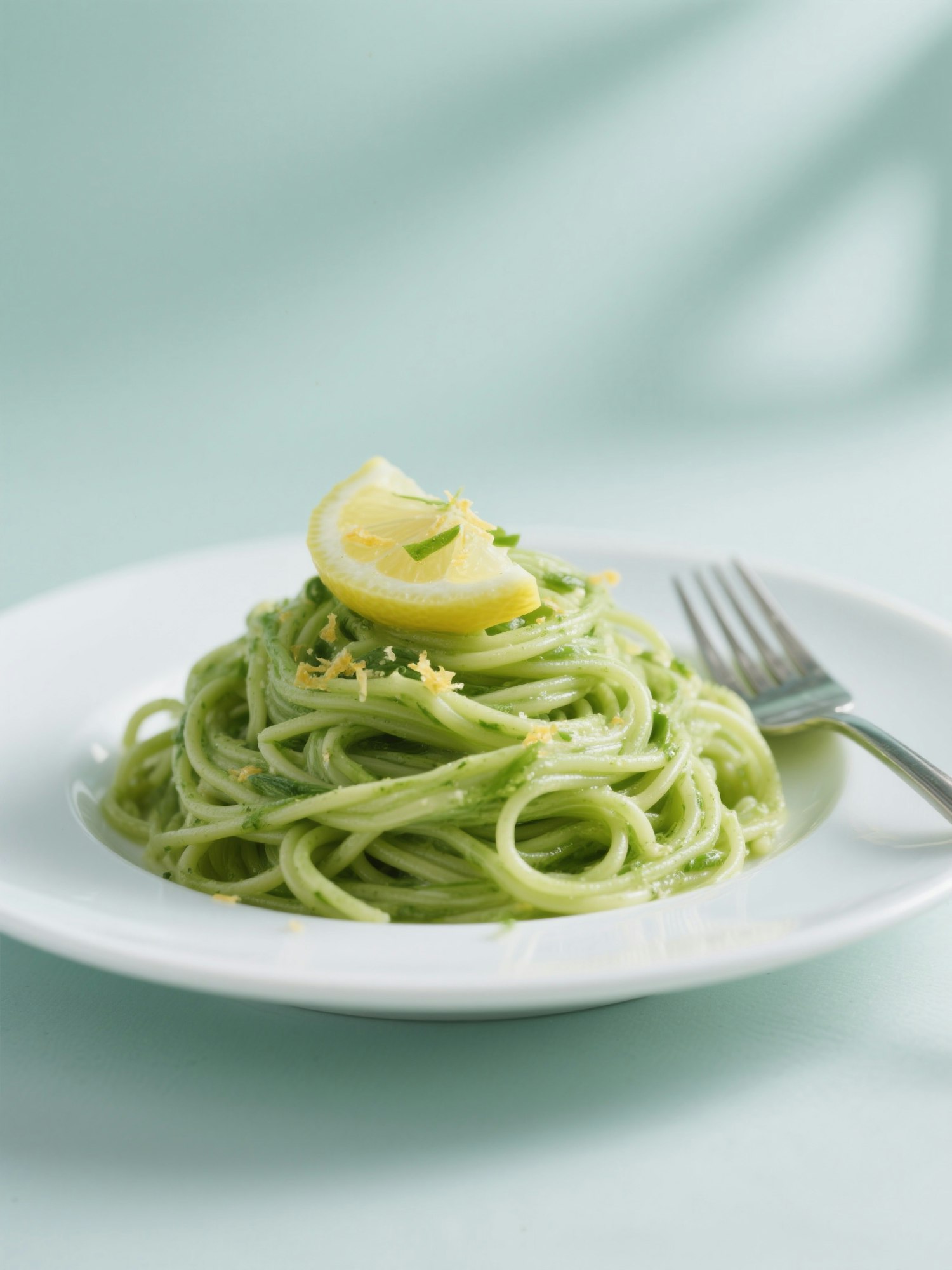 A plate of spaghetti with green pesto sauce, garnished with lemon and zest, served on a white plate with a fork. Fresh and vibrant!