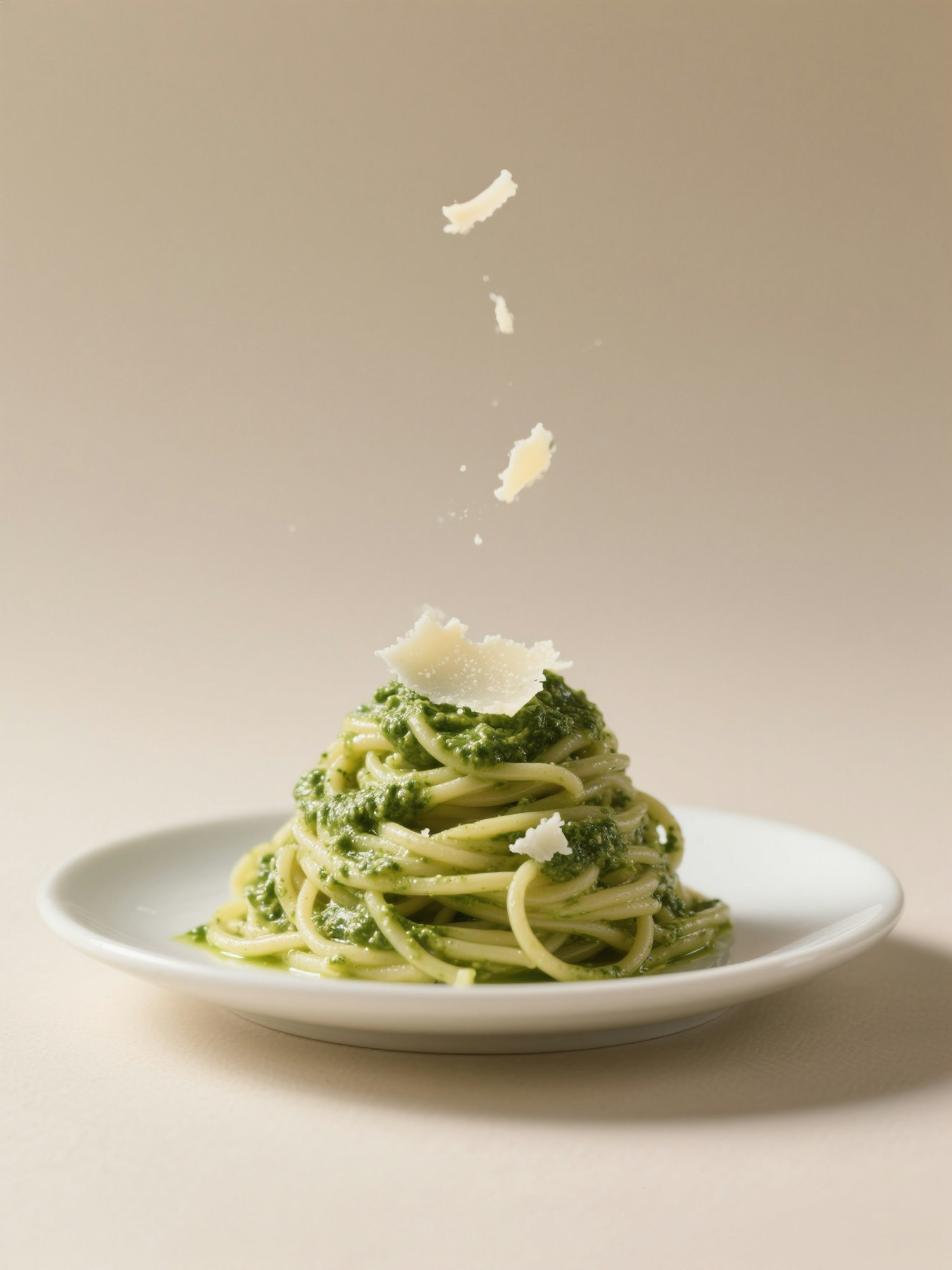 A plate of spaghetti with pesto sauce, topped with Parmesan cheese shavings falling mid-air, set against a neutral beige background.