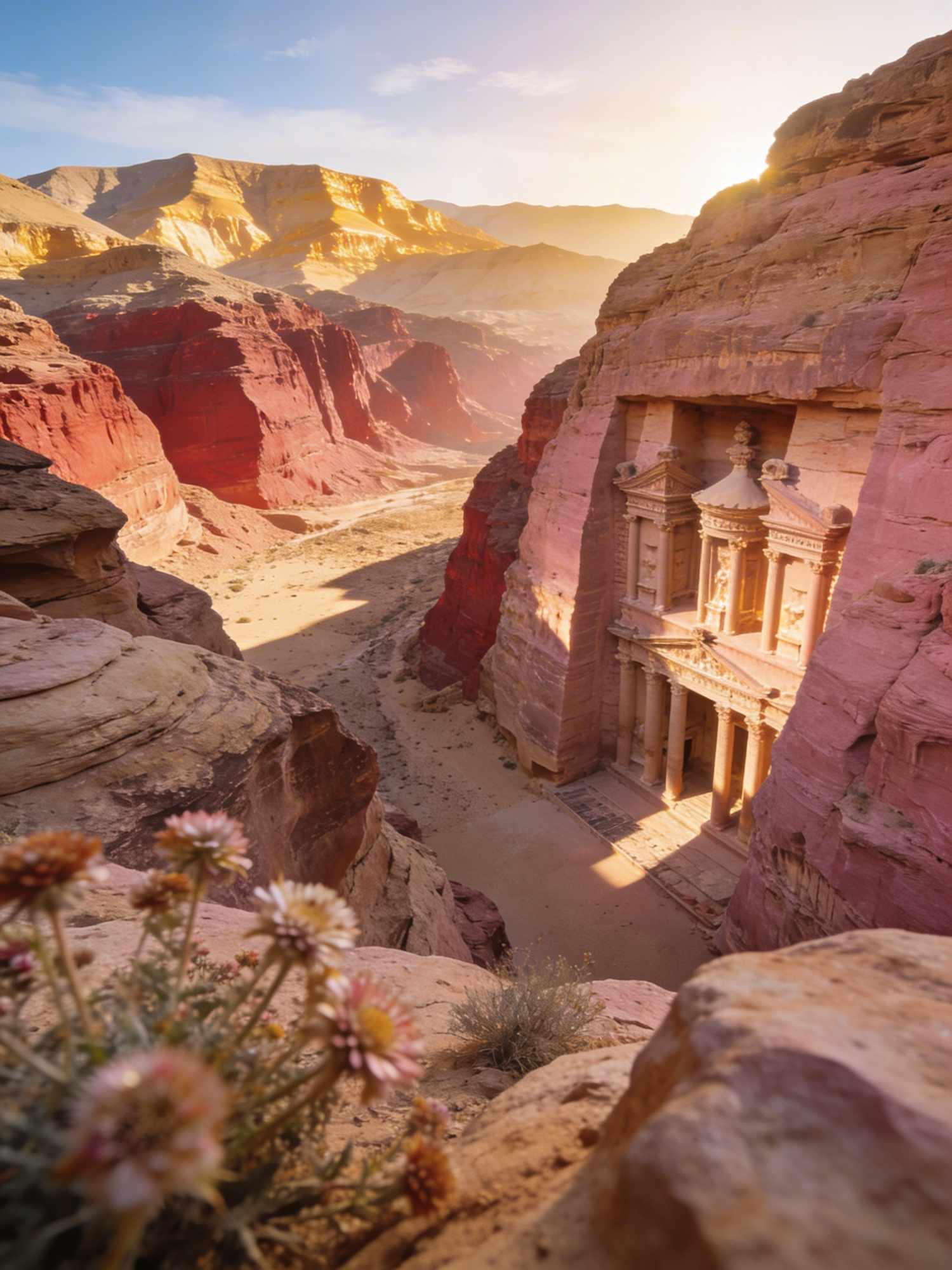 A stunning view of Petra's Al-Khazneh, bathed in golden light, with desert flowers in the foreground and rugged cliffs surrounding the scene.