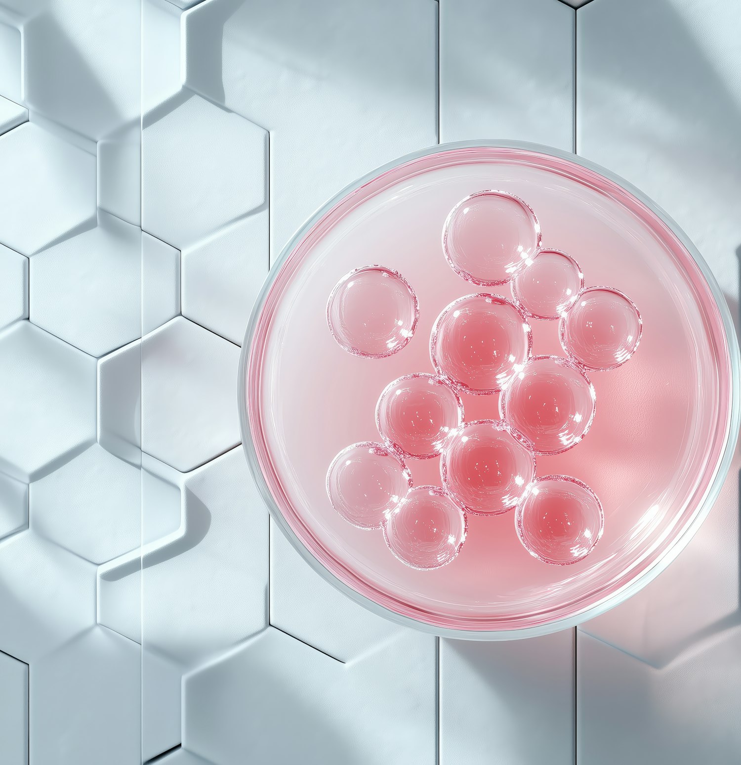 A petri dish with pink liquid and bubbles on a white hexagonal tile background, creating a clean and modern aesthetic.