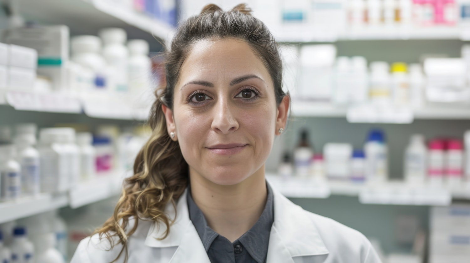 Confident female pharmacist in a white coat, standing in a pharmacy with shelves of medicines in the background.