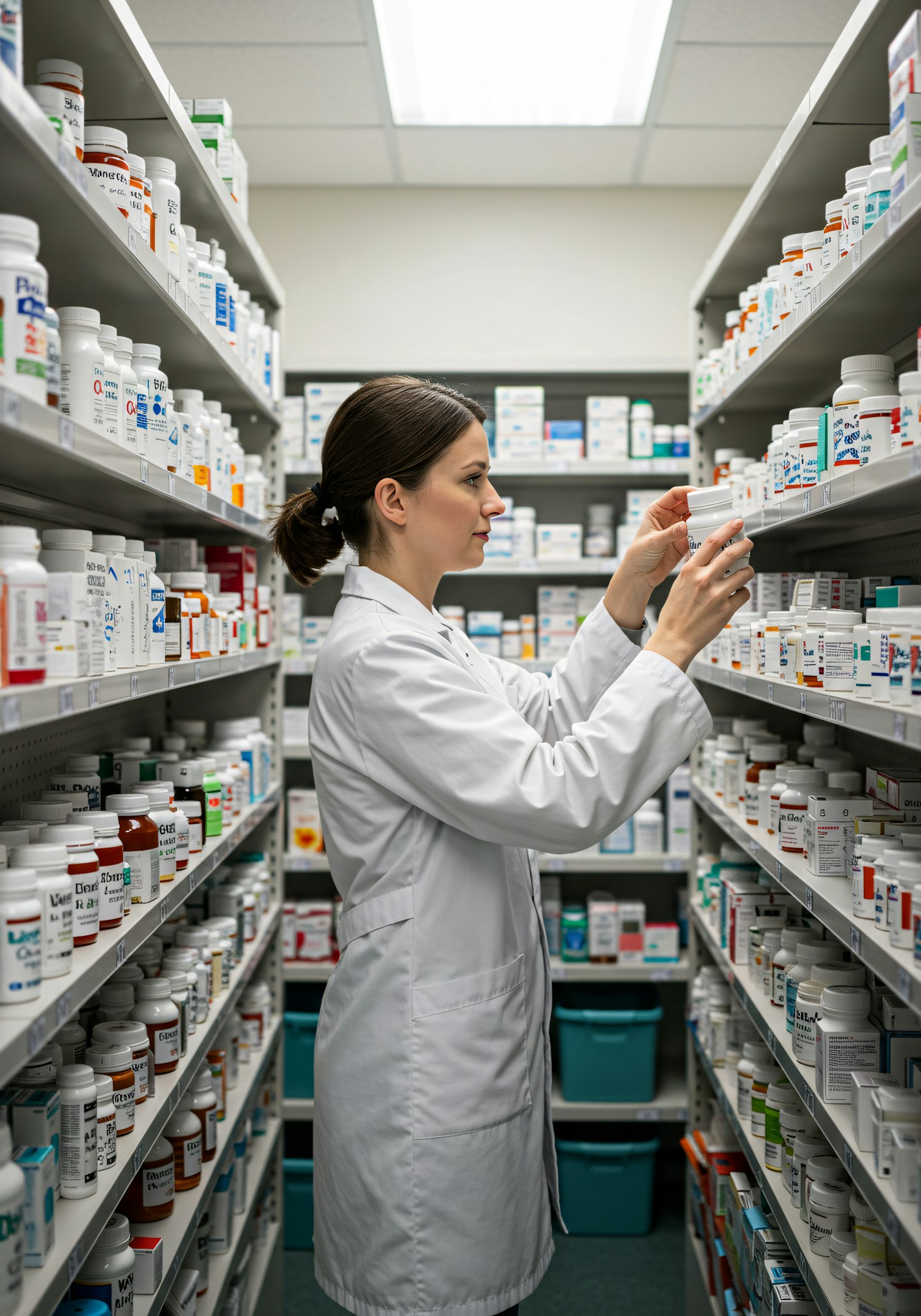 A pharmacist in a white coat examines a medication bottle in a well-organized pharmacy aisle filled with various medicines.