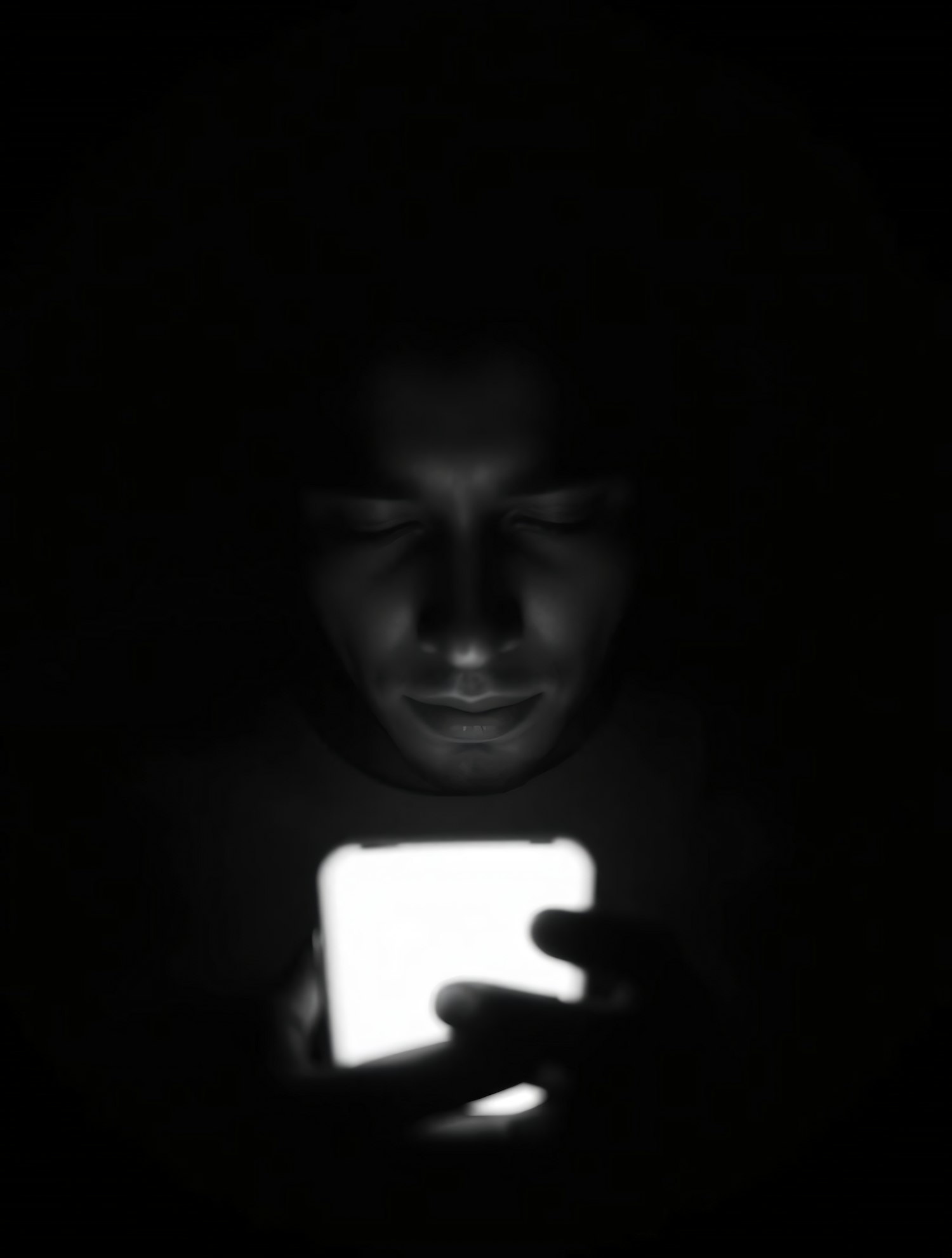 A person in a dark setting illuminated by the glow of a smartphone screen, creating a dramatic contrast of light and shadow.
