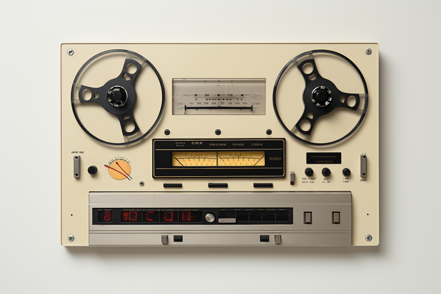 Vintage reel-to-reel tape recorder with beige casing, black reels, and analog VU meters. Retro design with digital display and control buttons.