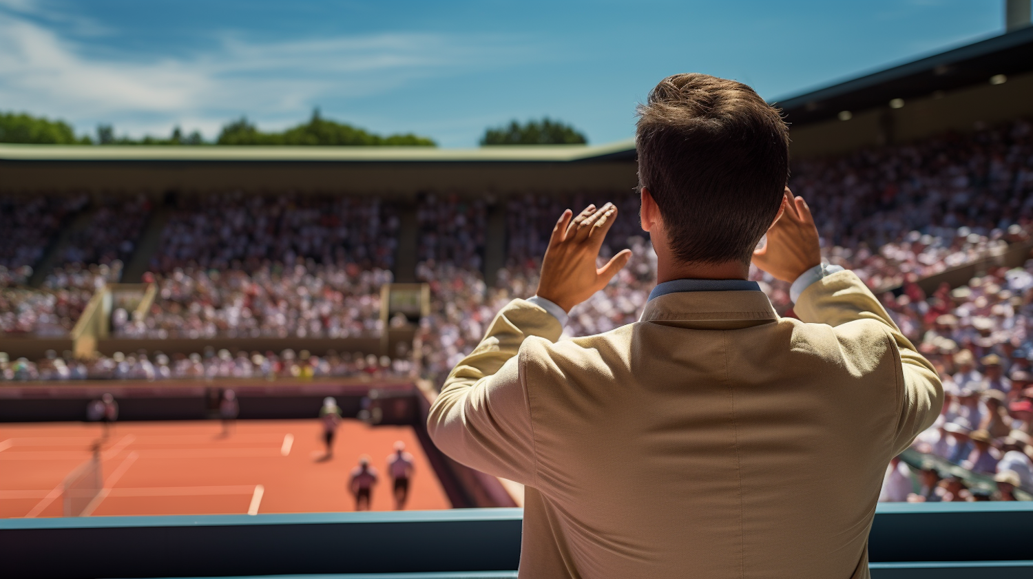 Man in beige suit applauding at a lively tennis match in a packed outdoor stadium on a sunny day.