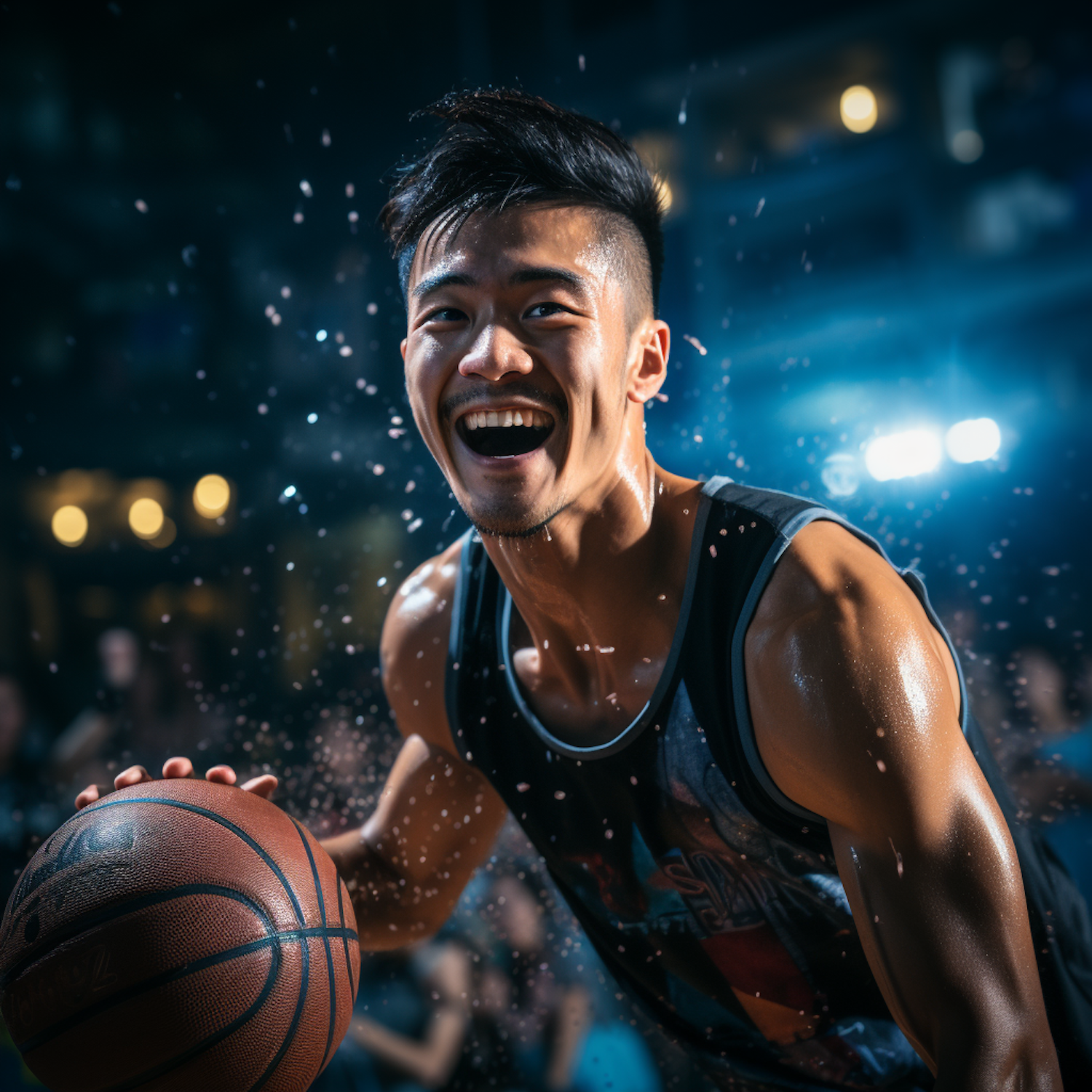 Energetic Asian basketball player in action, smiling with intensity under bright lights, capturing the thrill of the game.