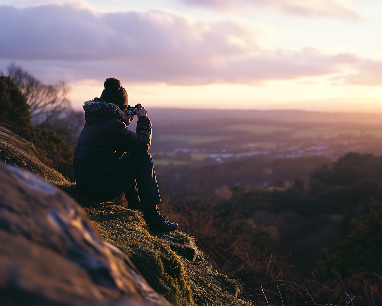 Person photographing a scenic sunset from a cliff, wearing a warm jacket and hat, with a vast landscape in the background.