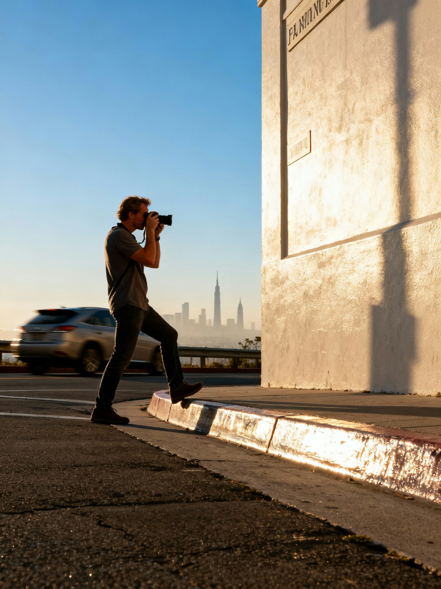 A photographer captures a moment in warm sunlight, with a city skyline in the background and a car passing by on the road.