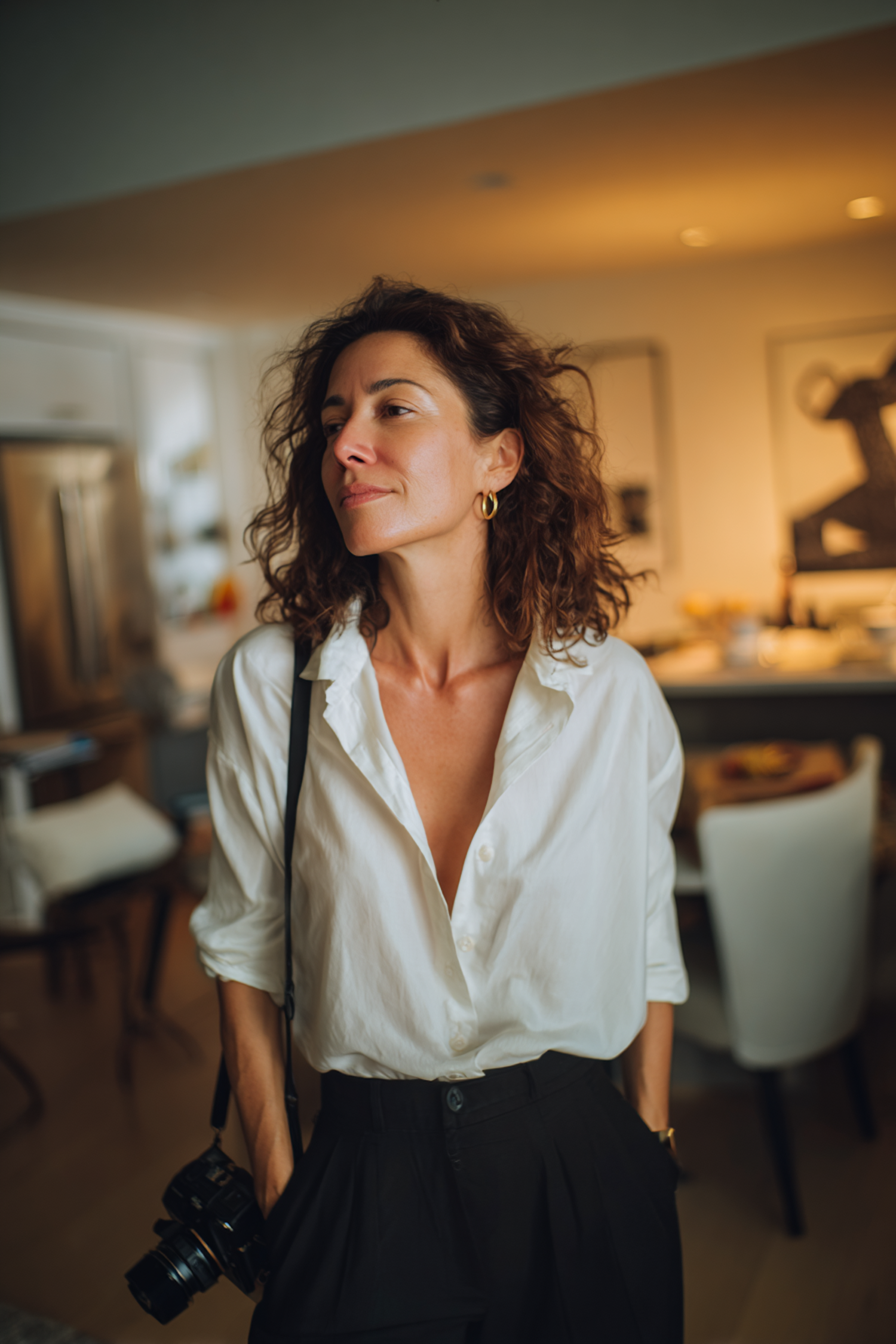 A woman with curly hair in a white shirt and black trousers holds a camera in a warmly lit modern interior.
