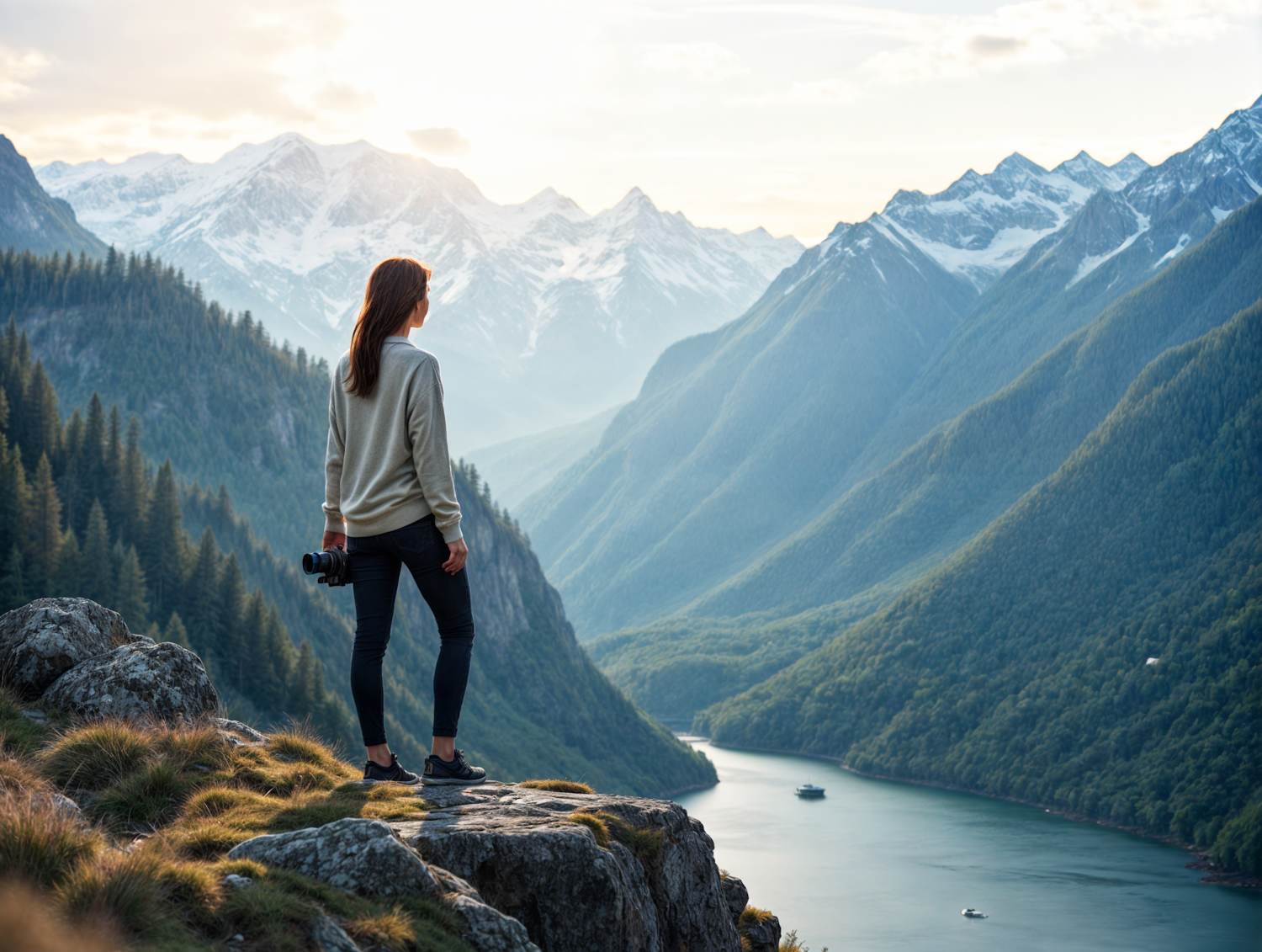 Woman with camera stands on a cliff, overlooking stunning snow-capped mountains and a winding river below.