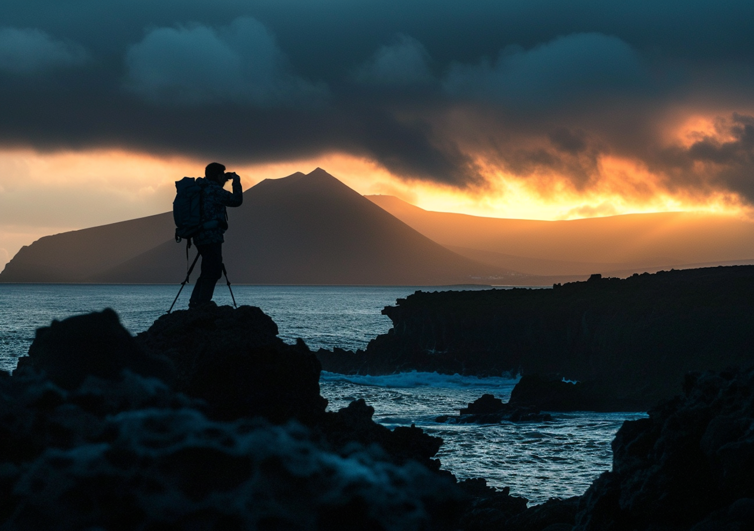 Silhouette of a photographer capturing a stunning sunset over a mountainous landscape with dramatic clouds and ocean waves.