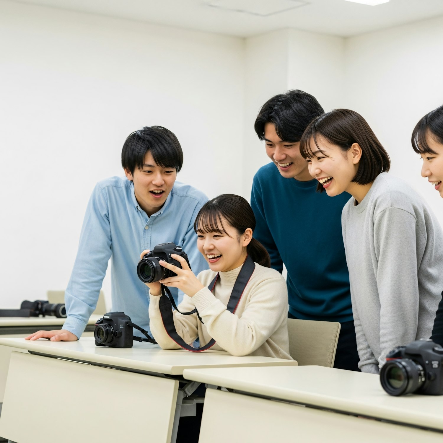A group of students in a photography class excitedly reviewing photos on a camera, surrounded by desks and equipment in a bright classroom.