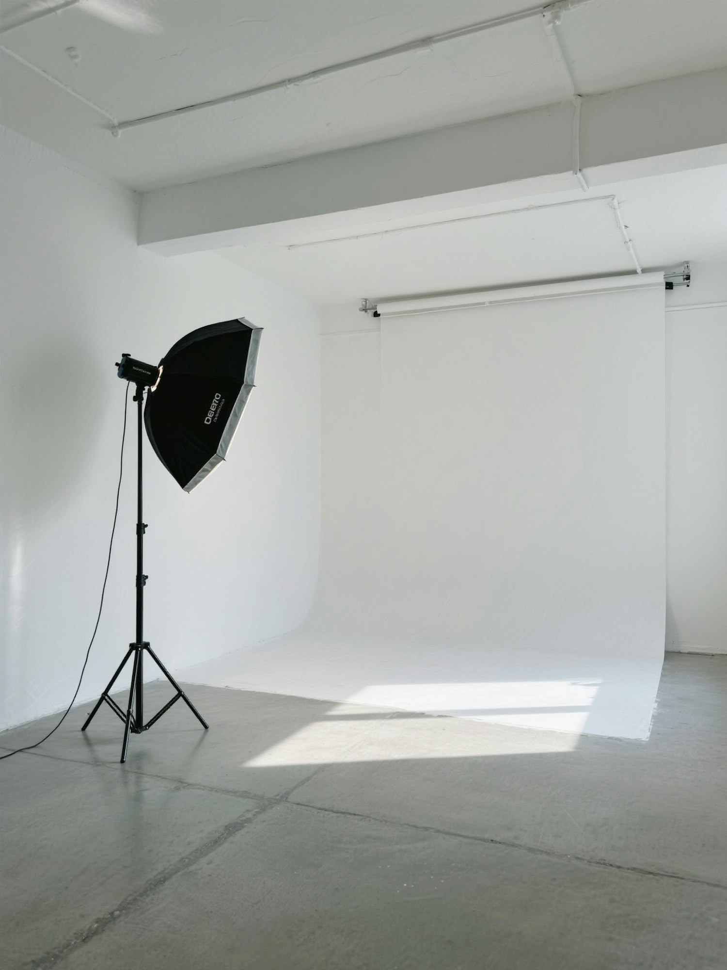 Minimalist photography studio with a white seamless backdrop, softbox lighting, and a clean, modern aesthetic.