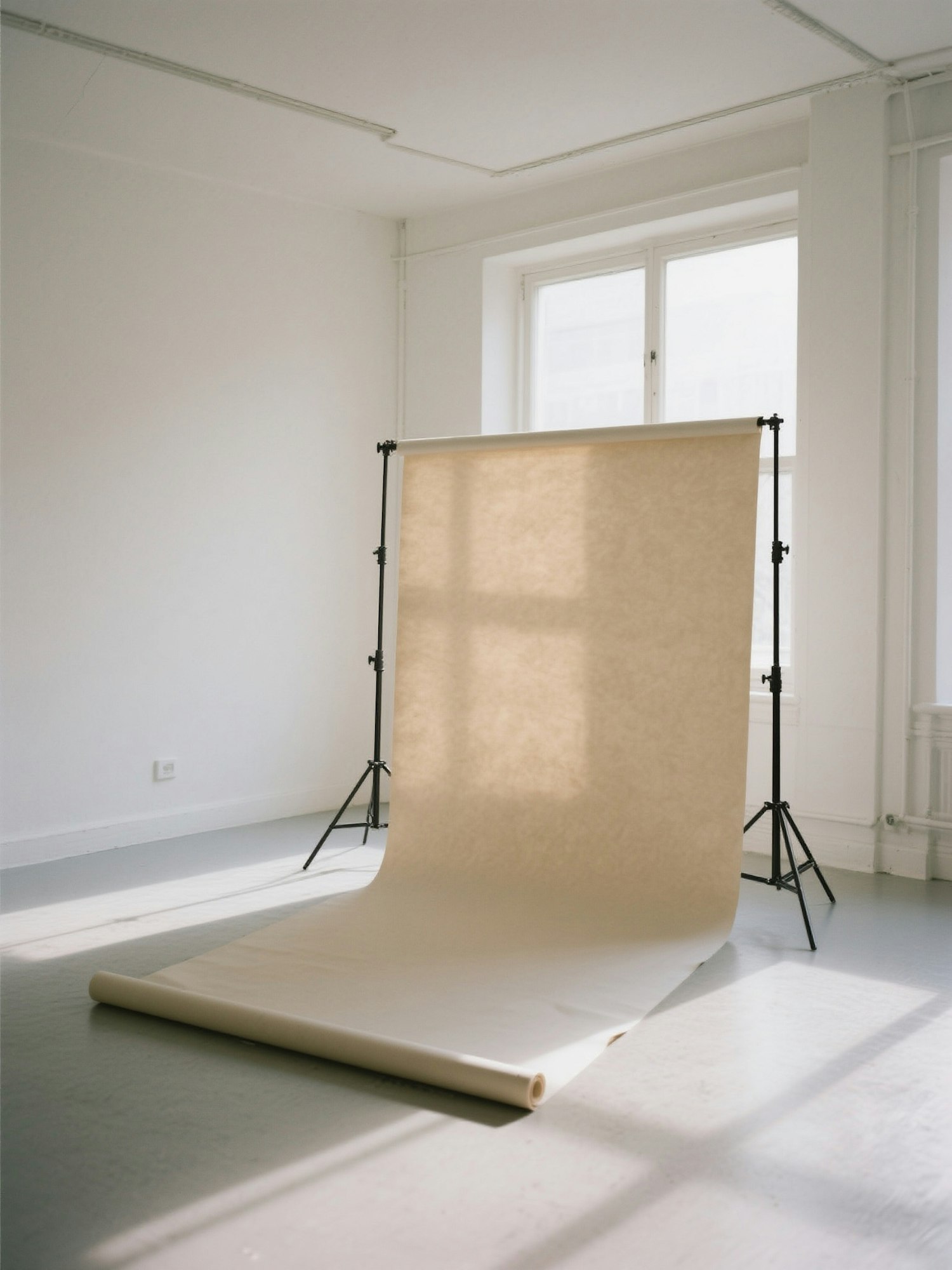 A minimalist photography studio with a seamless beige paper backdrop on a stand, unrolled onto the floor, empty space around, soft natural daylight, white walls, ready for text to be added